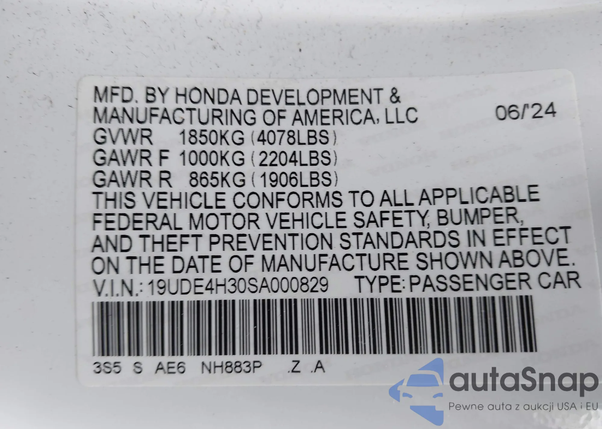 LOT: 43579580 VIN: JHMZF1C63FS001442