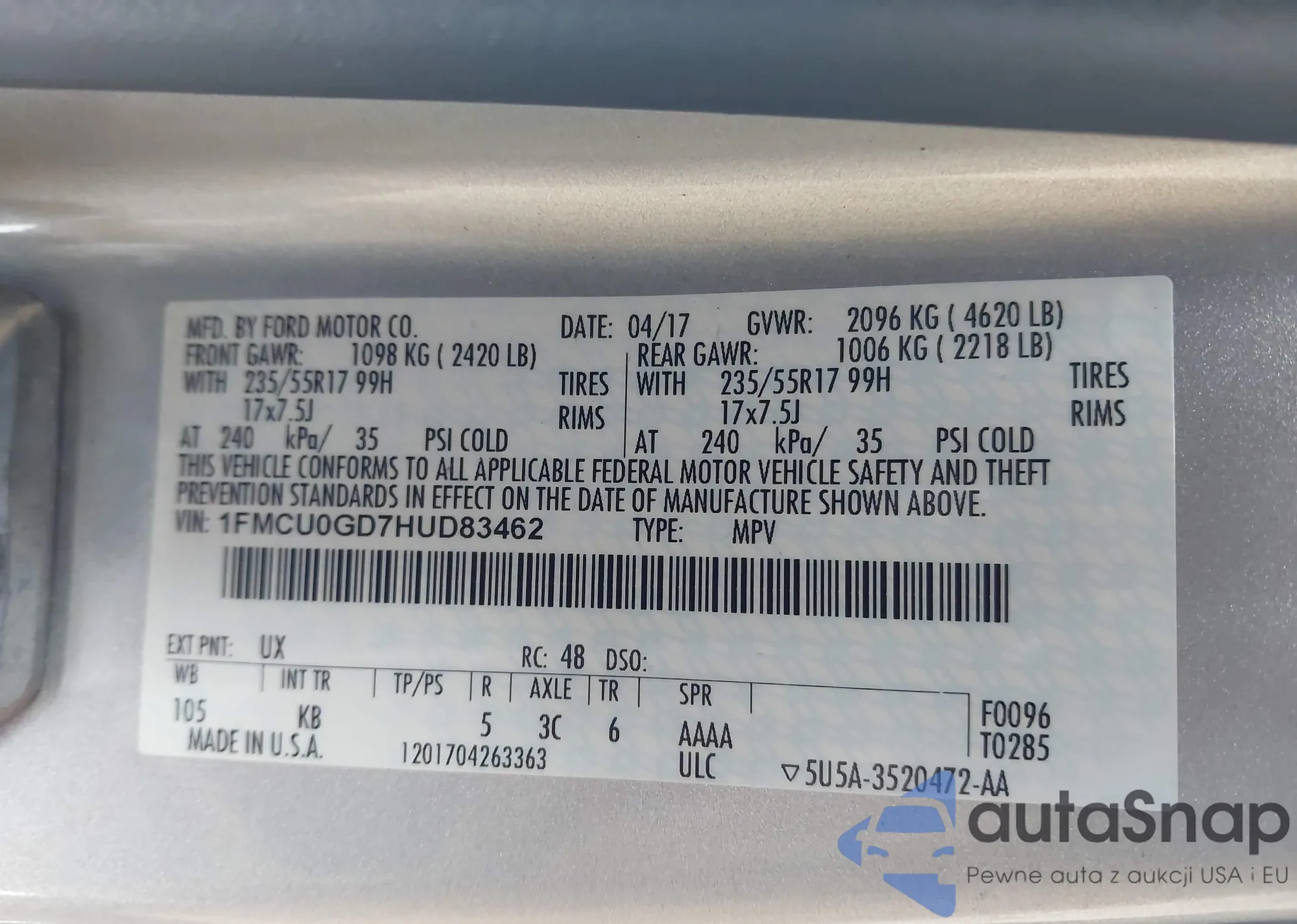 • VIN 1FMCU0GD7HUD83462