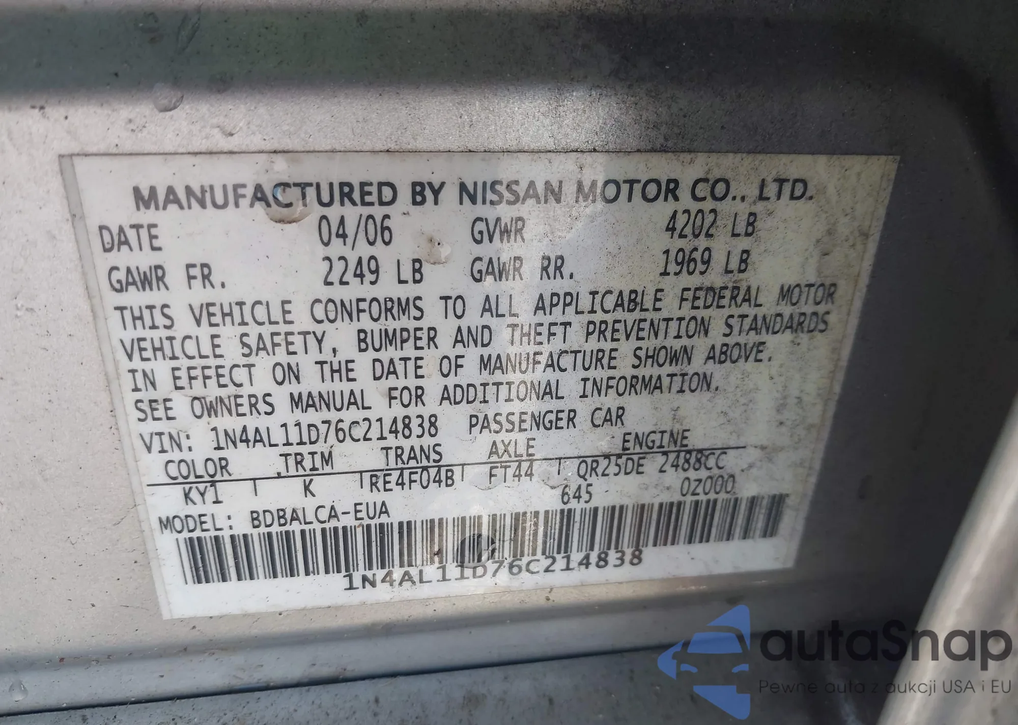 • VIN 1N4AL11D76C214838