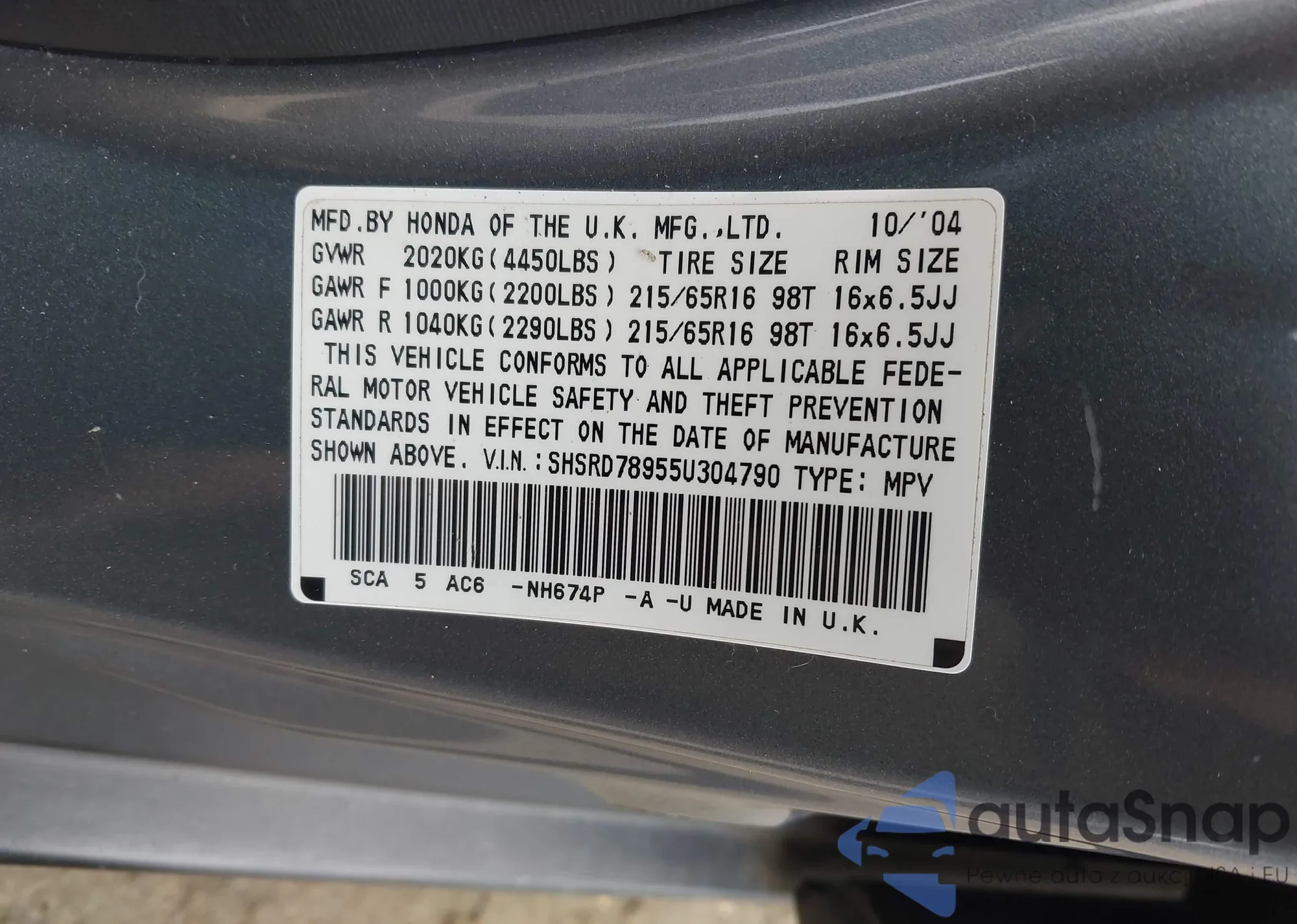 LOT: 44163060 VIN: SHSRD78955U304790