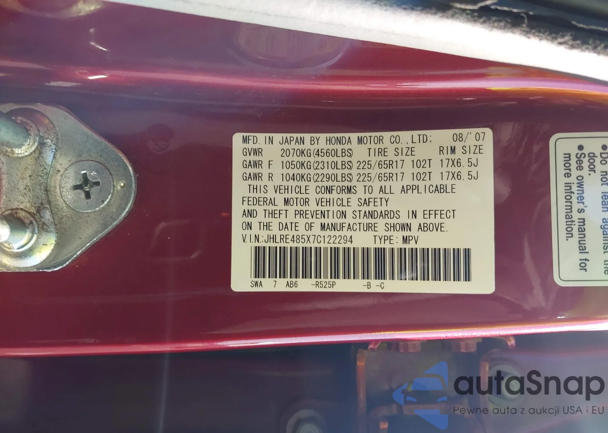 • VIN JHLRE485X7C122294