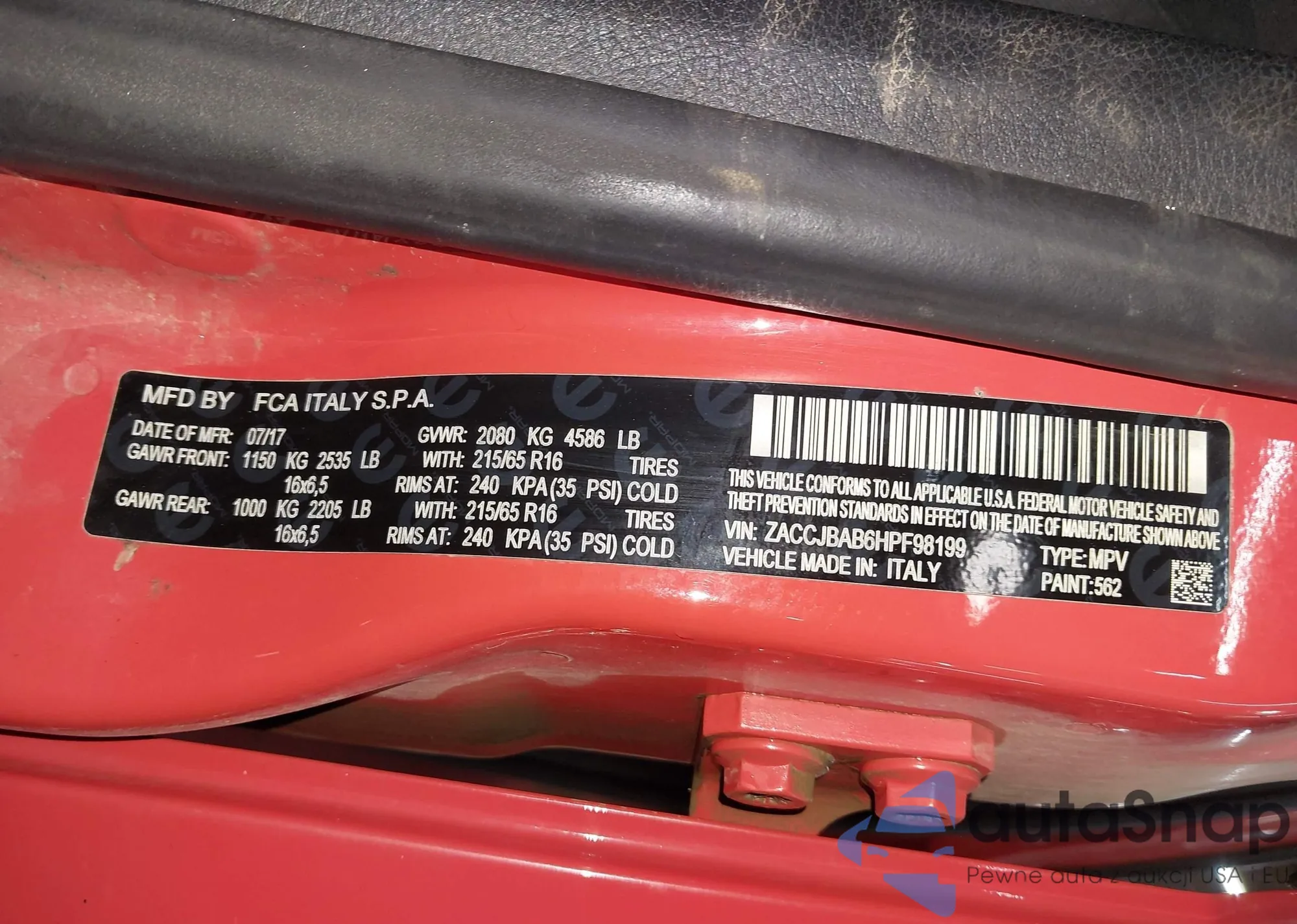LOT: 43936136 VIN: ZACCJBAB6HPF98199