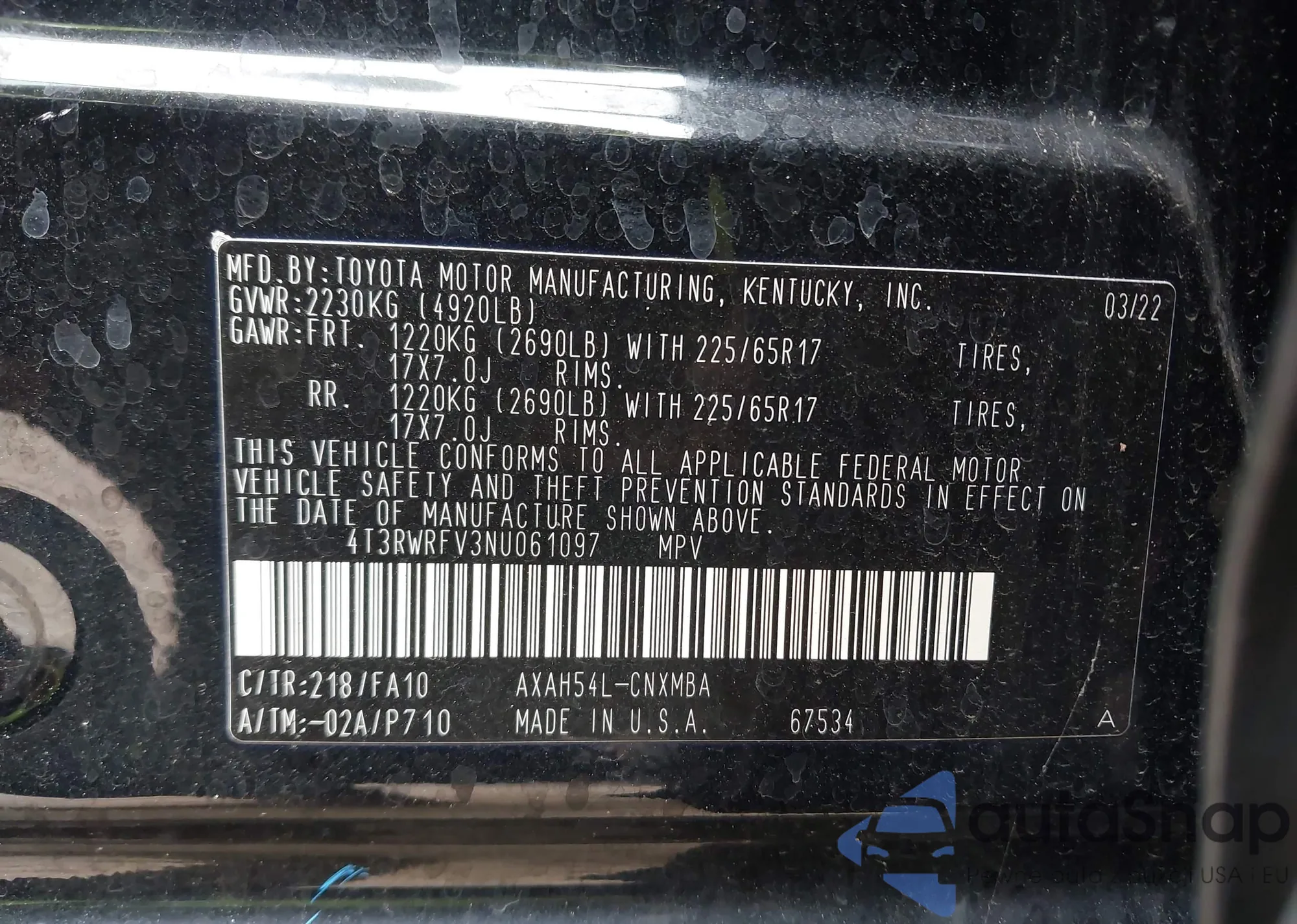 LOT: 44052037 VIN: 4T3RWRFV3NU061097