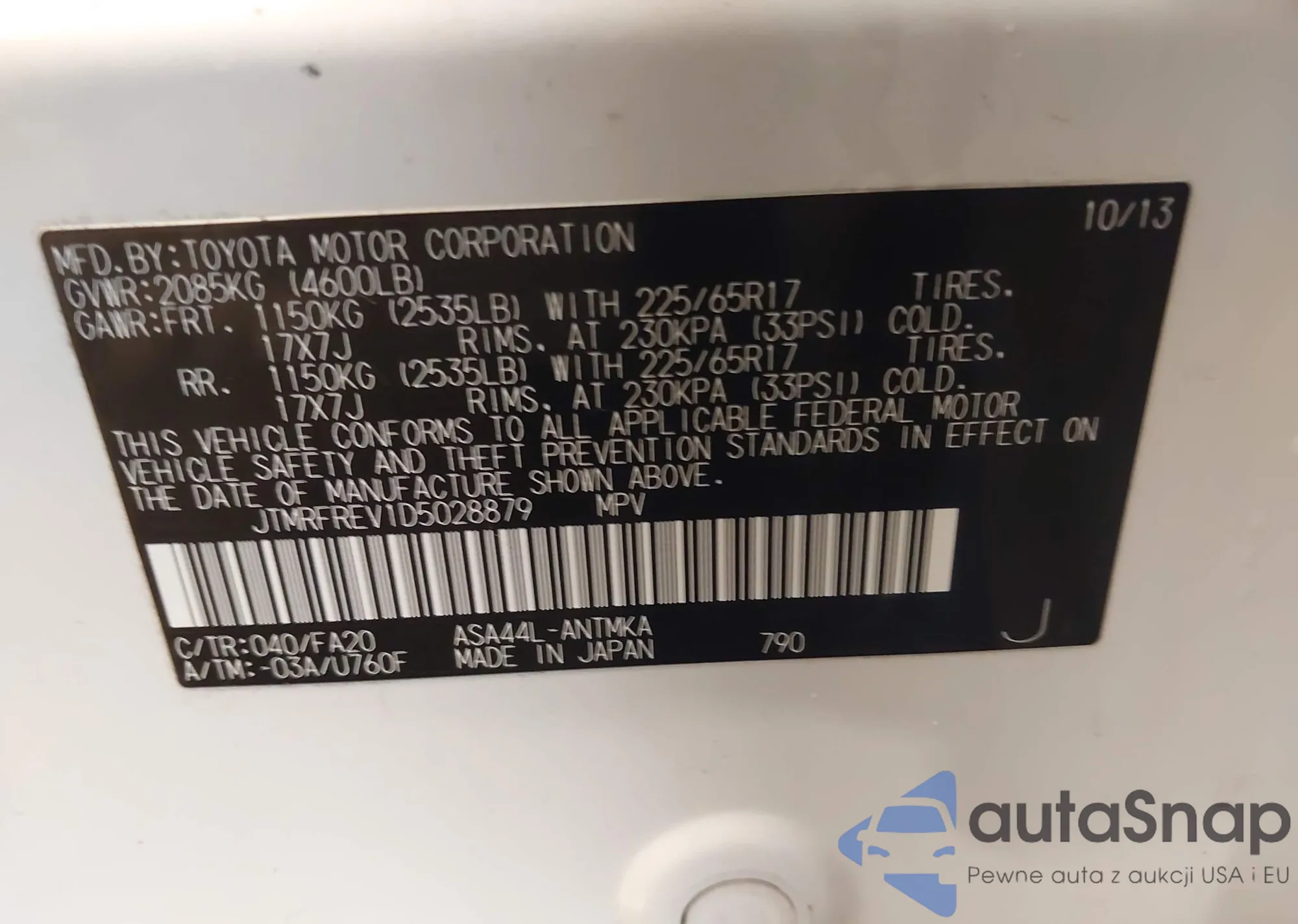 LOT: 43686807 VIN: JTMRFREV1D5028879