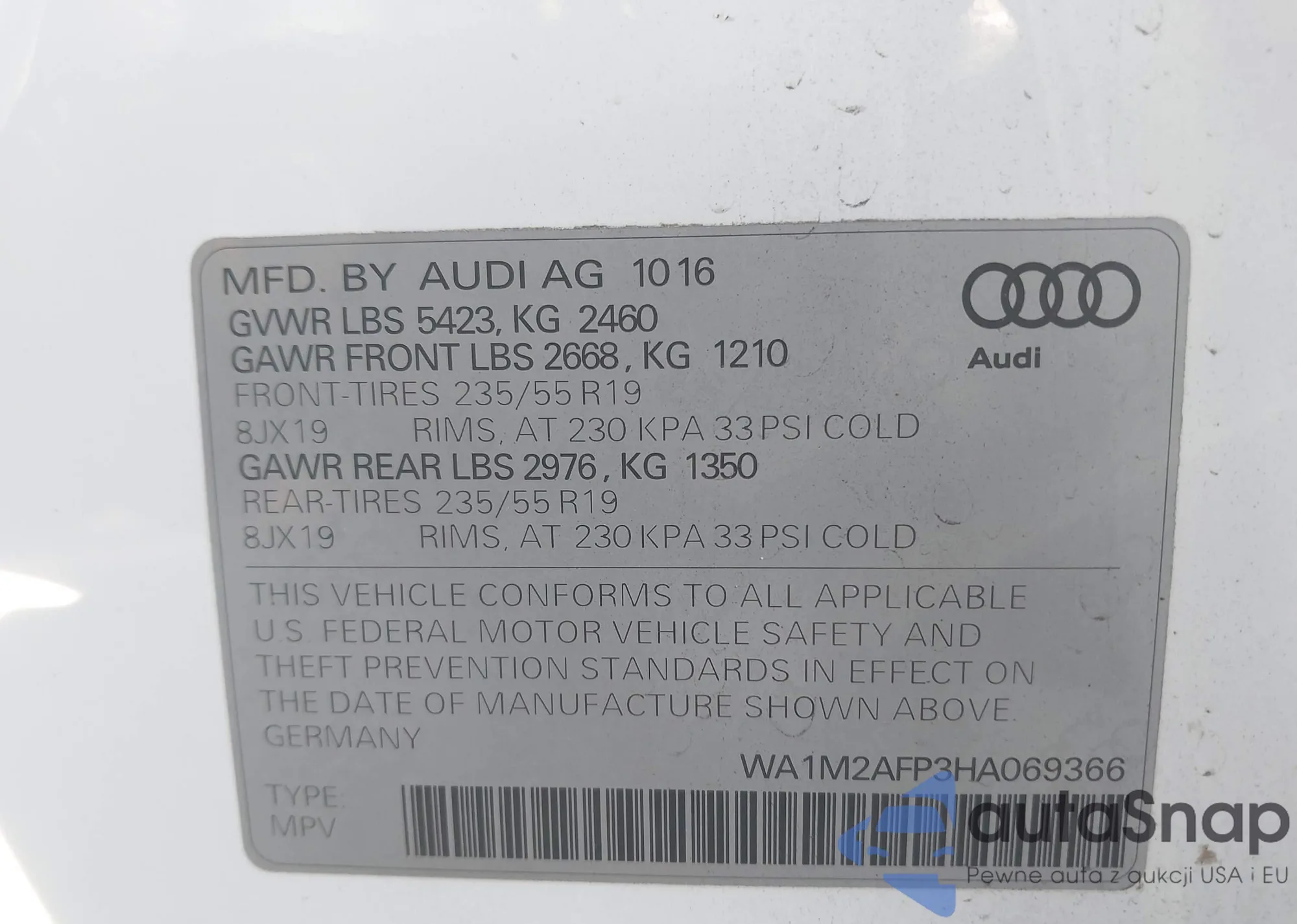 LOT: 43794234 VIN: WA1EVAF13MD027425