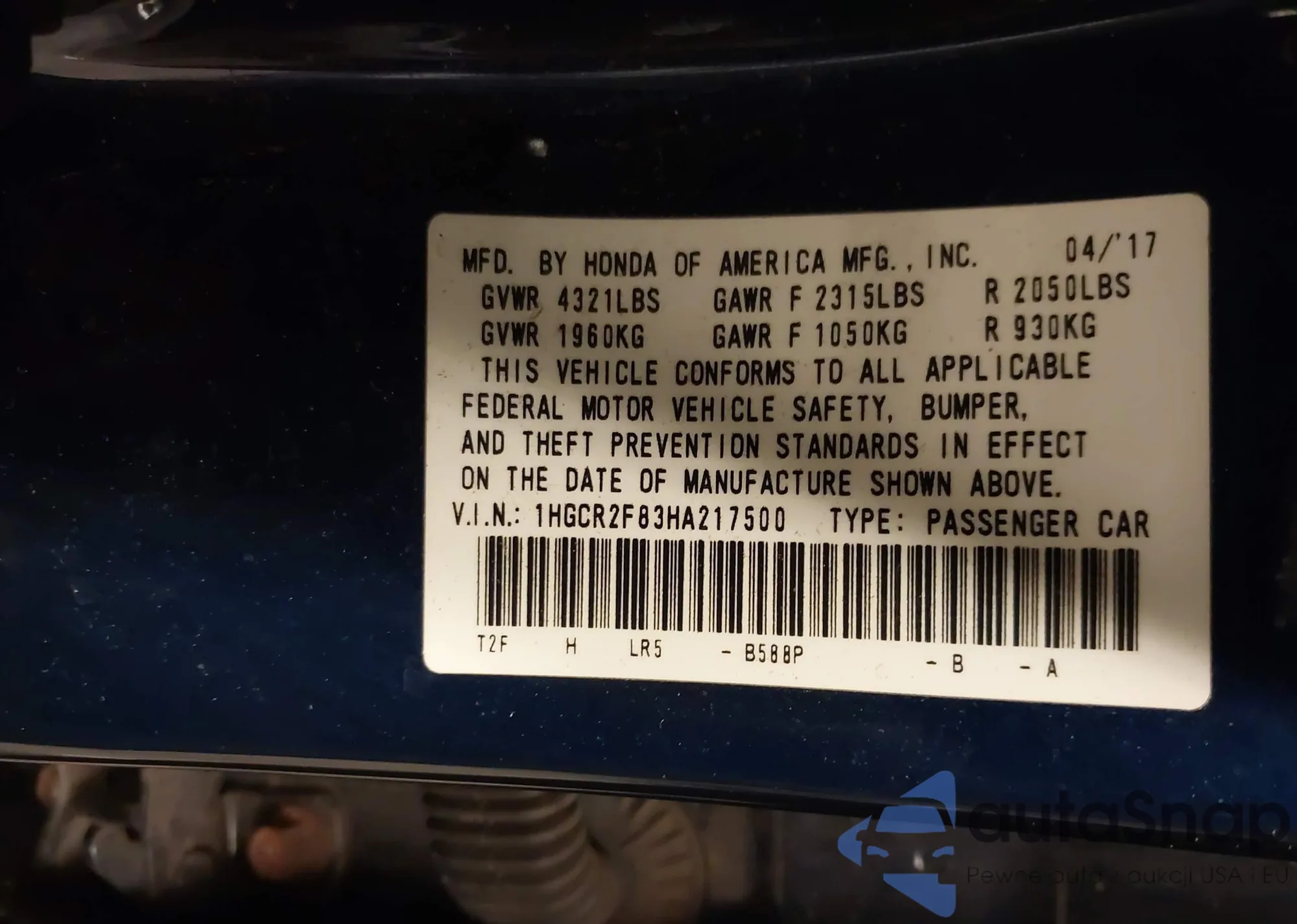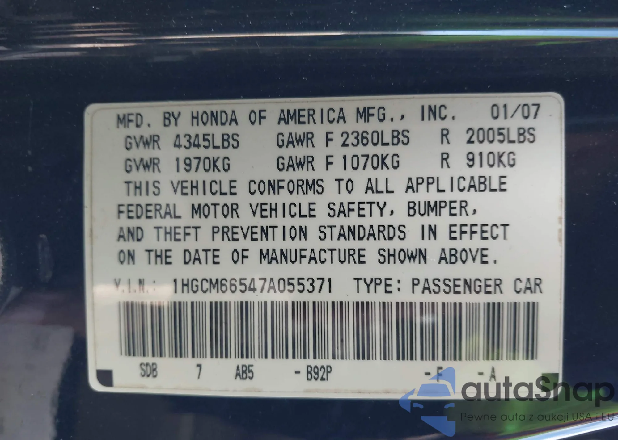 LOT: 44179735 VIN: 1HGCM66547A055371