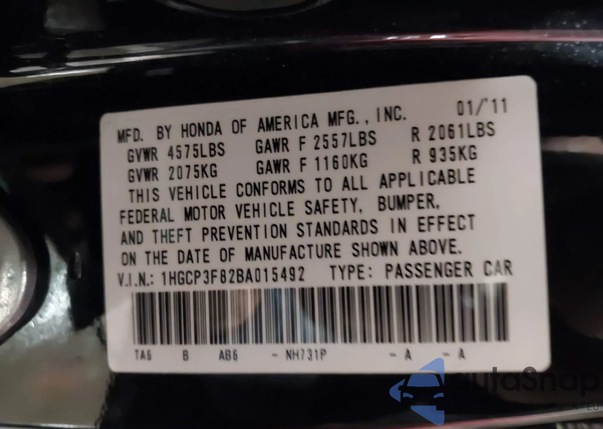 • VIN 1HGCP3F82BA015492