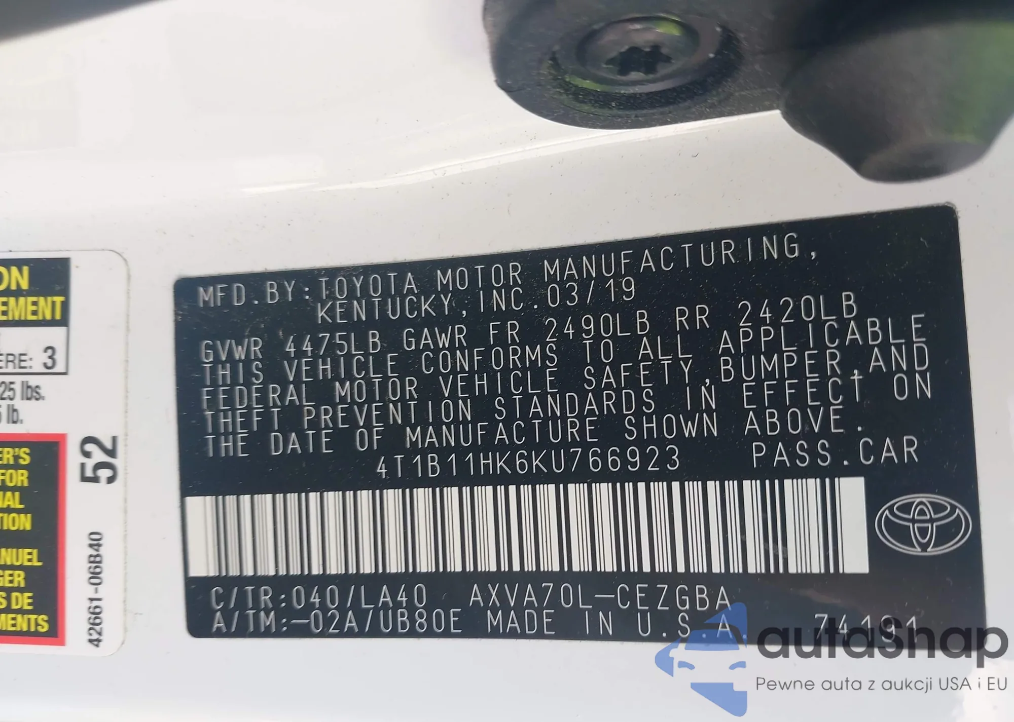 LOT: 44246149 VIN: 4T1B11HK6KU766923