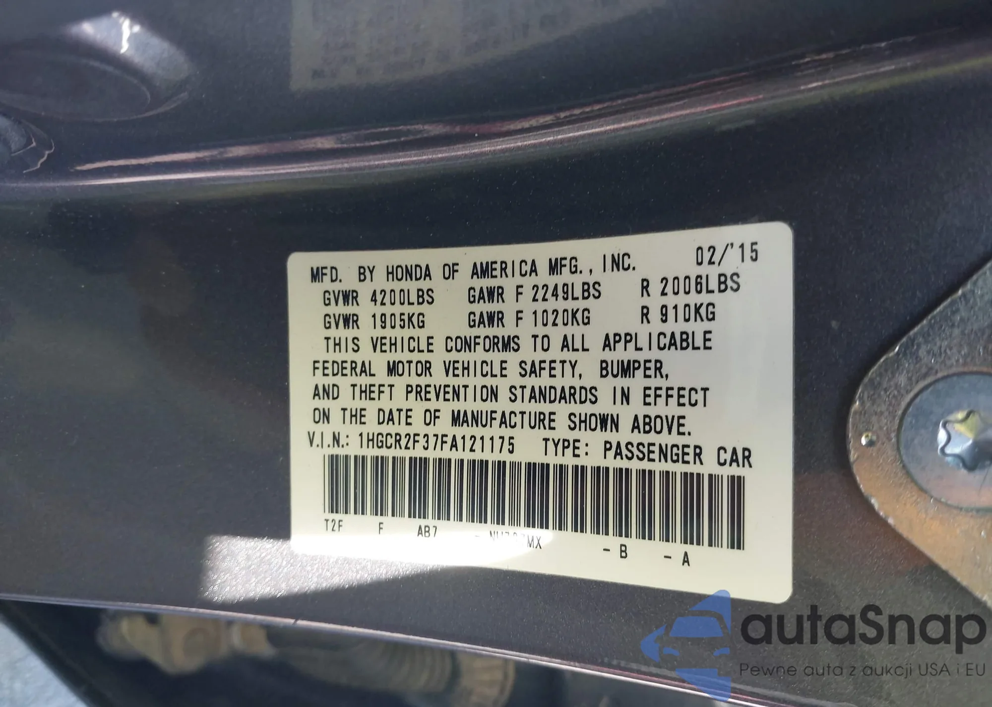 LOT: 44045551 VIN: 1HGCR2F37FA121175