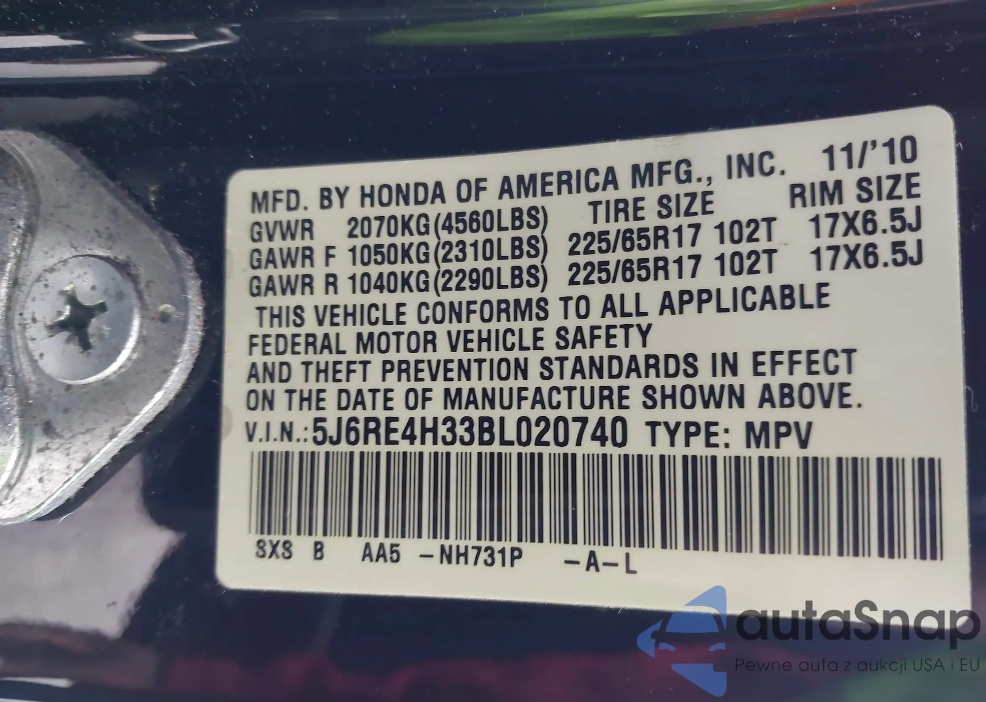 • VIN 2HKRM3H59EH530247