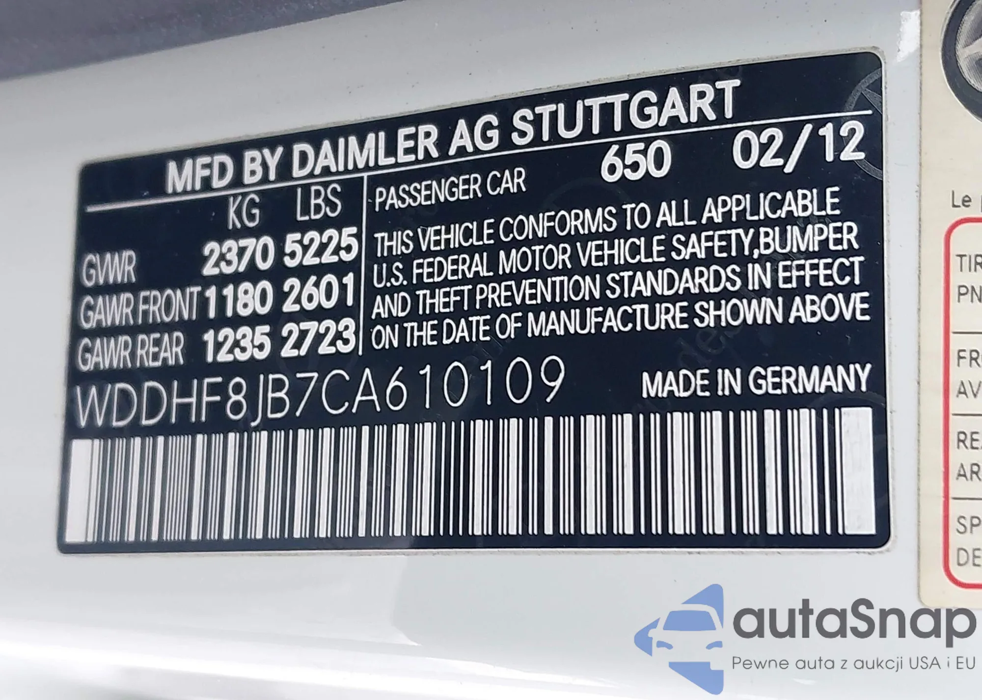LOT: 44062705 VIN: WDDHF8JB7CA610109