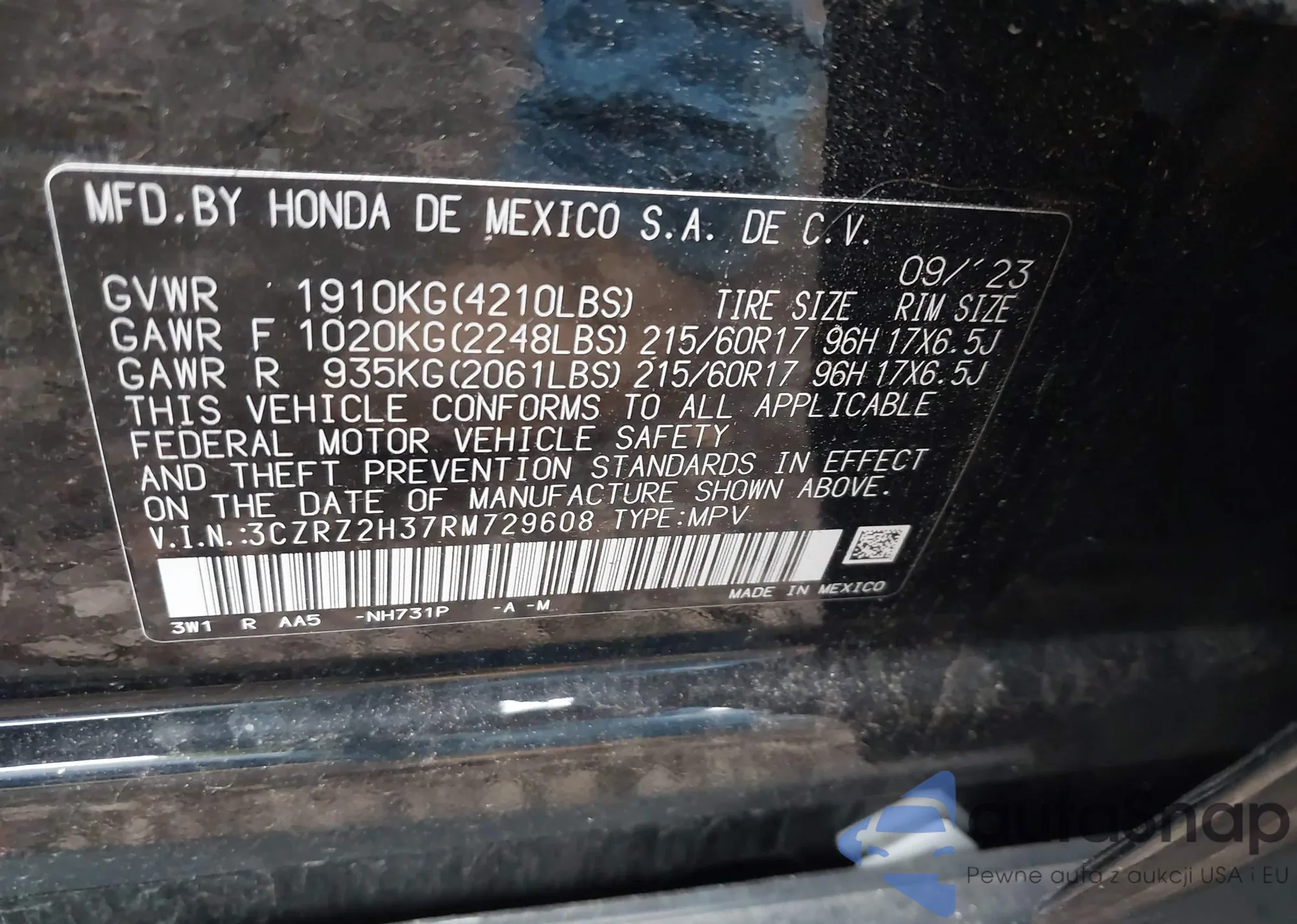 • VIN 3CZRZ2H37RM729608
