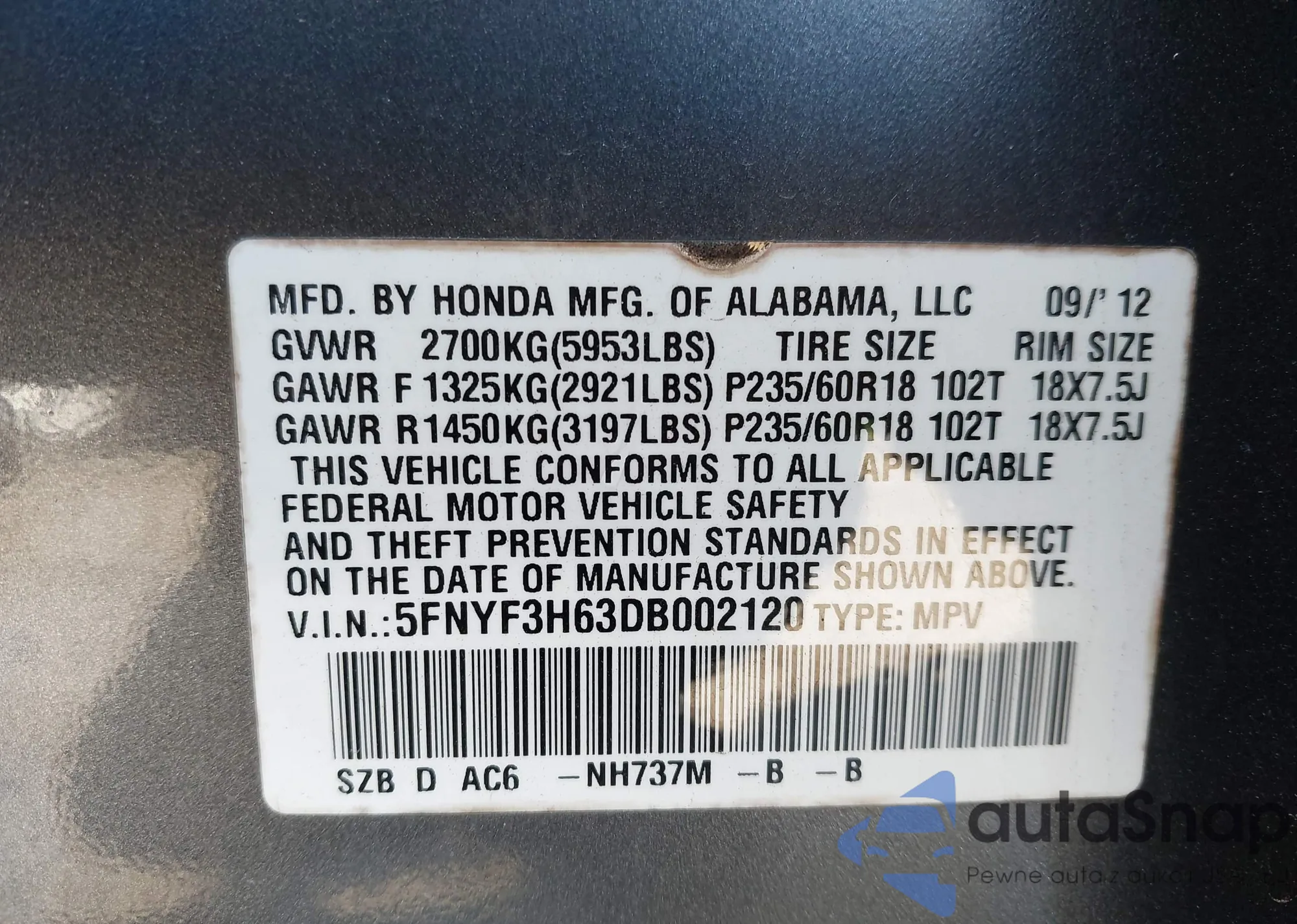 • VIN 5FNYF3H63DB002120