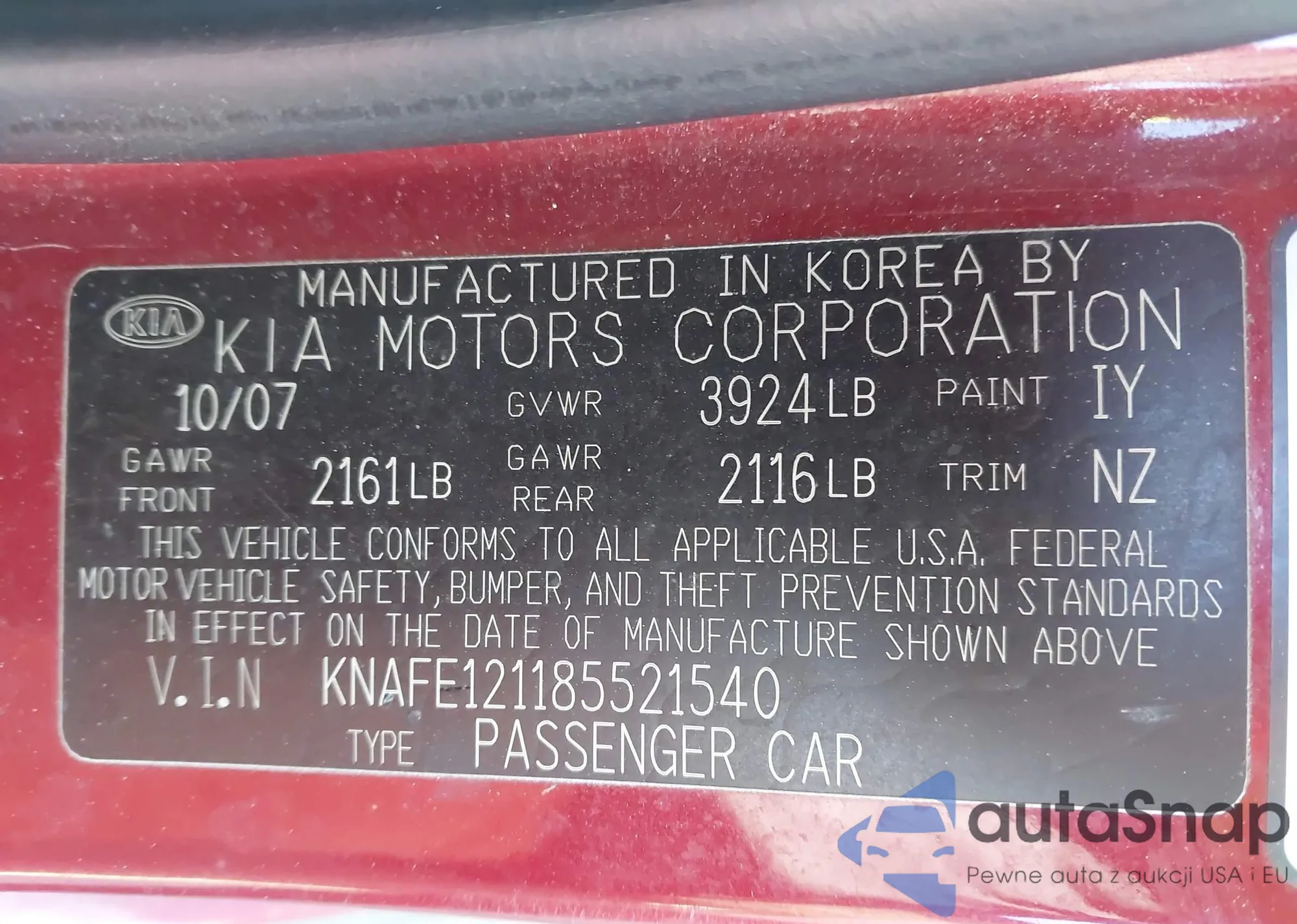 LOT: 44161899 VIN: KNAFE121185521540