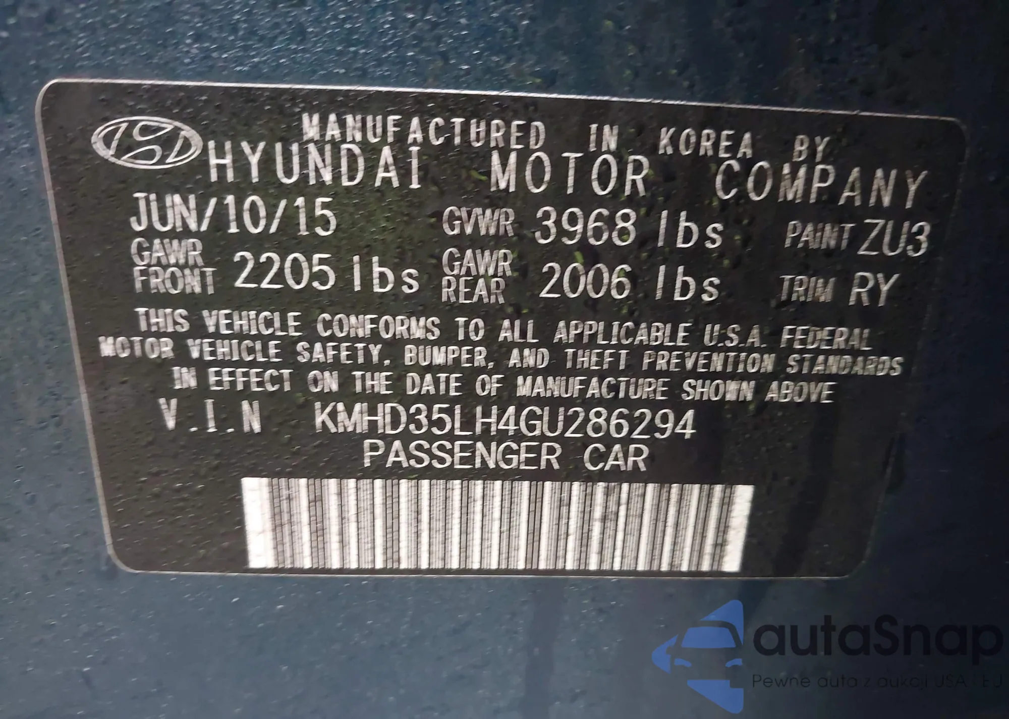 LOT: 44021300 VIN: KMHD35LH4GU286294