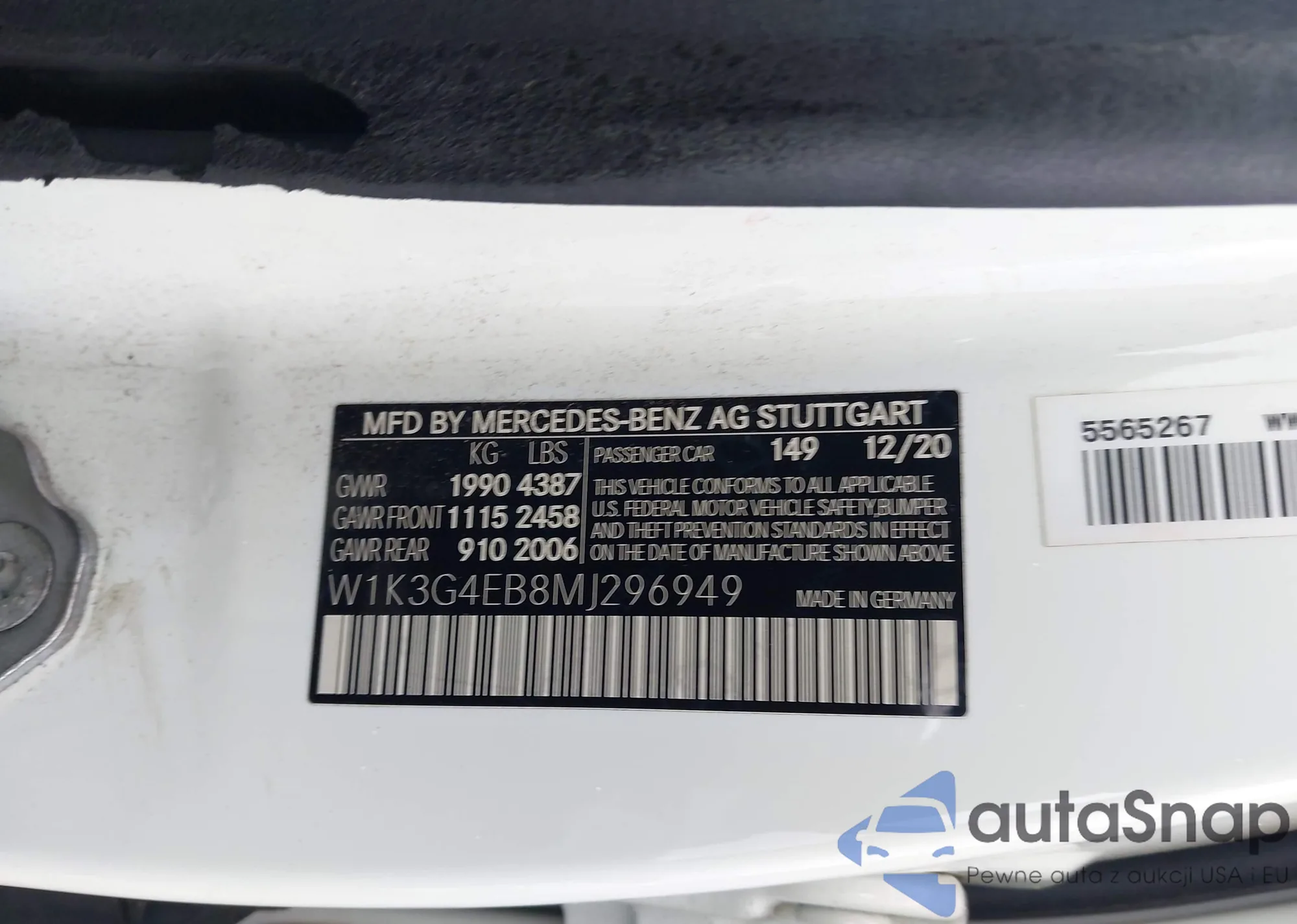 LOT: 43897876 VIN: W1K3G4EB8MJ296949