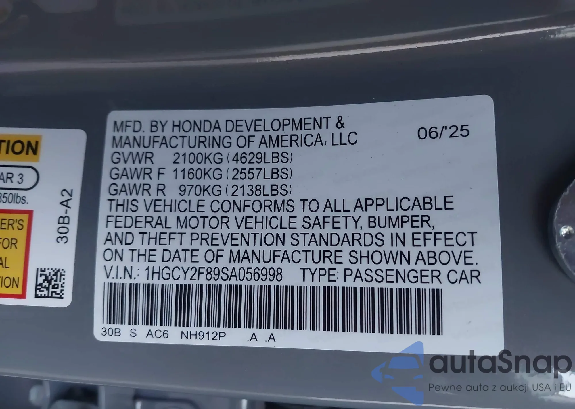 • VIN 1HGCY2F89SA056998