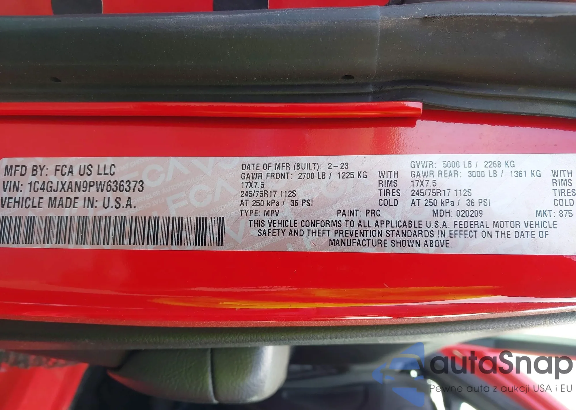 • VIN 1C4GJXAN9PW636373