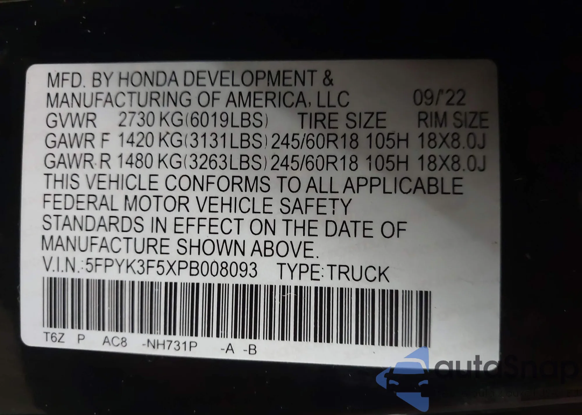 • VIN 5FPYK3F5XPB008093