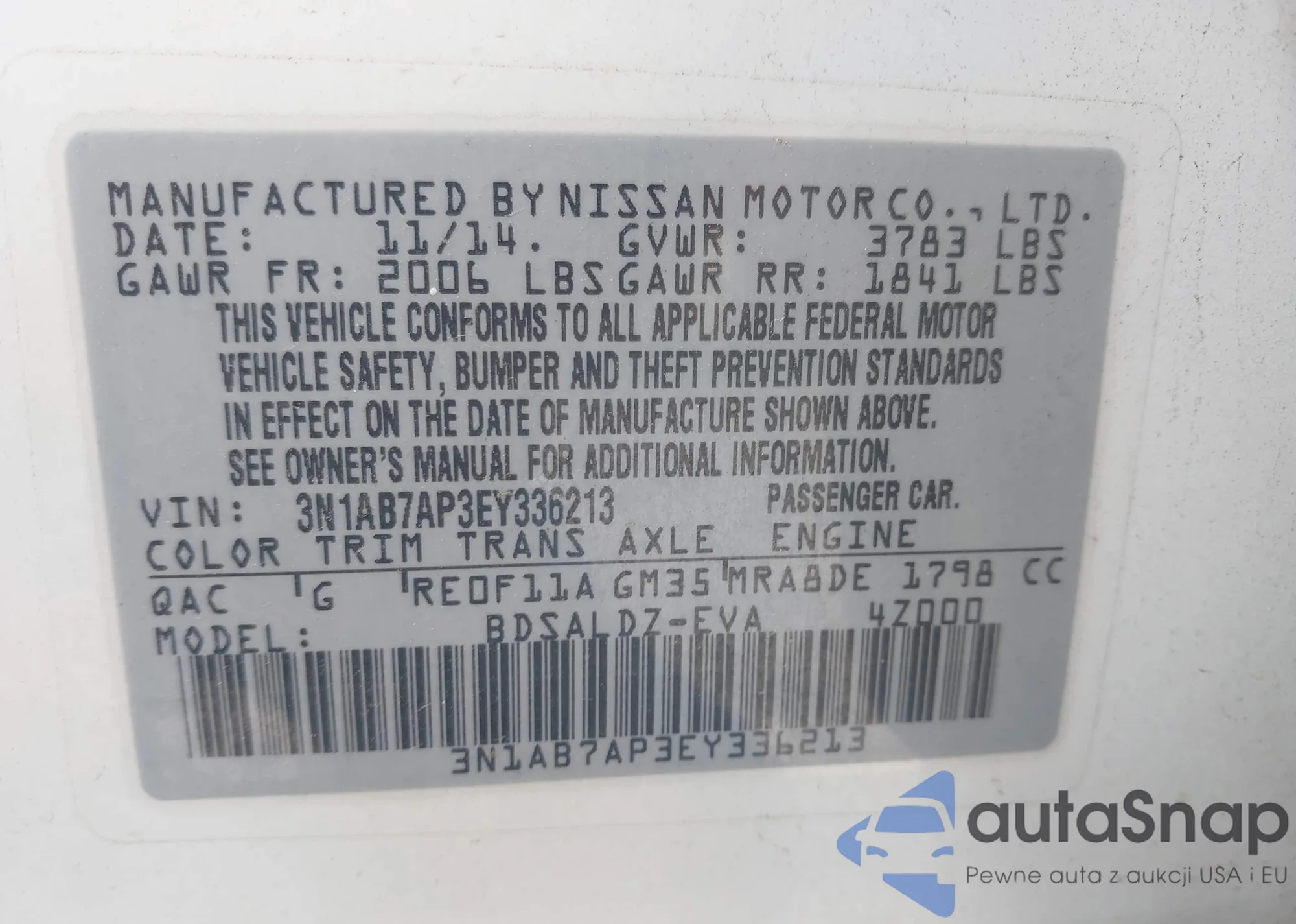 • VIN 3N1AB7AP3EY336213