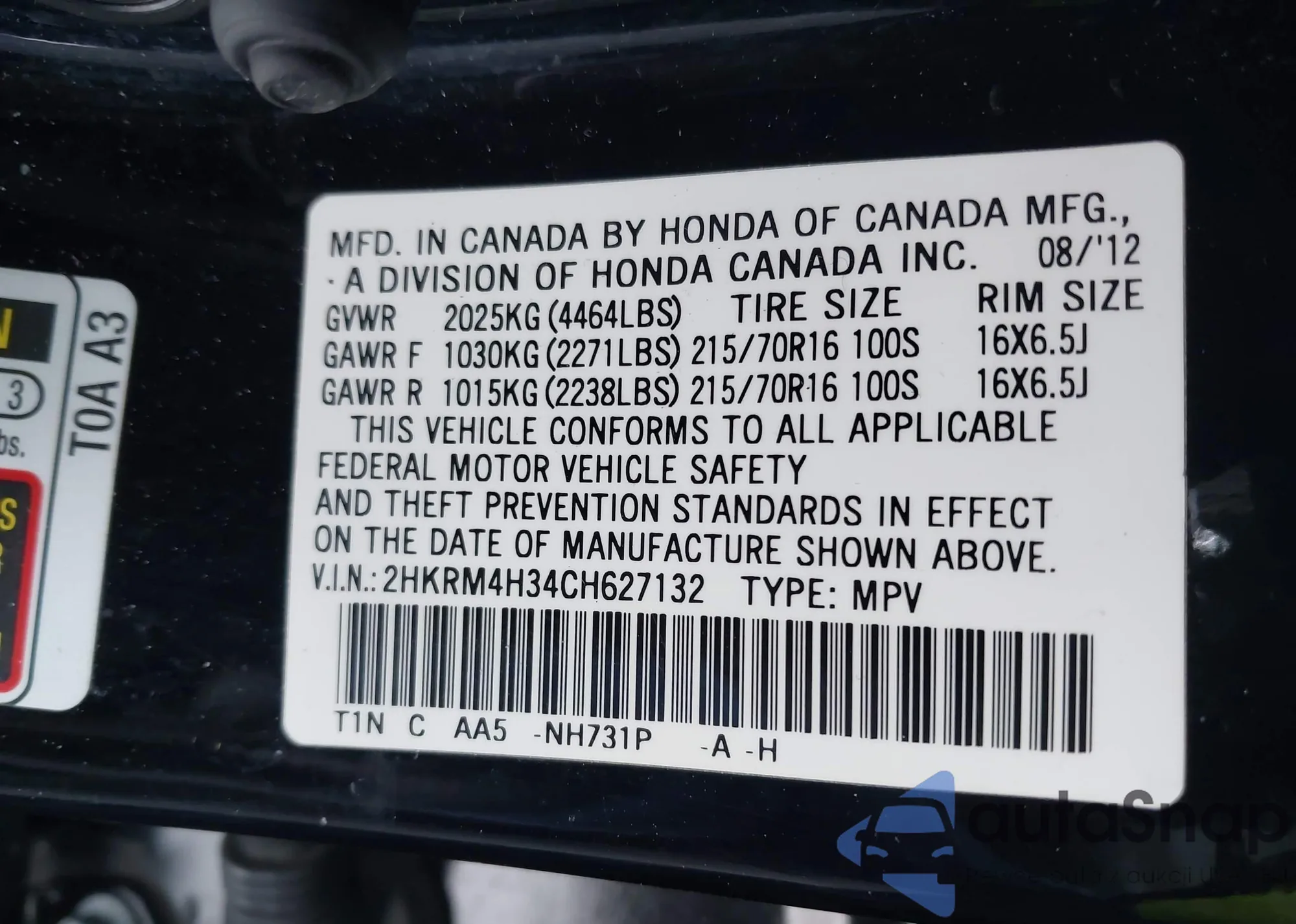 • VIN 2HKRM4H34CH627132
