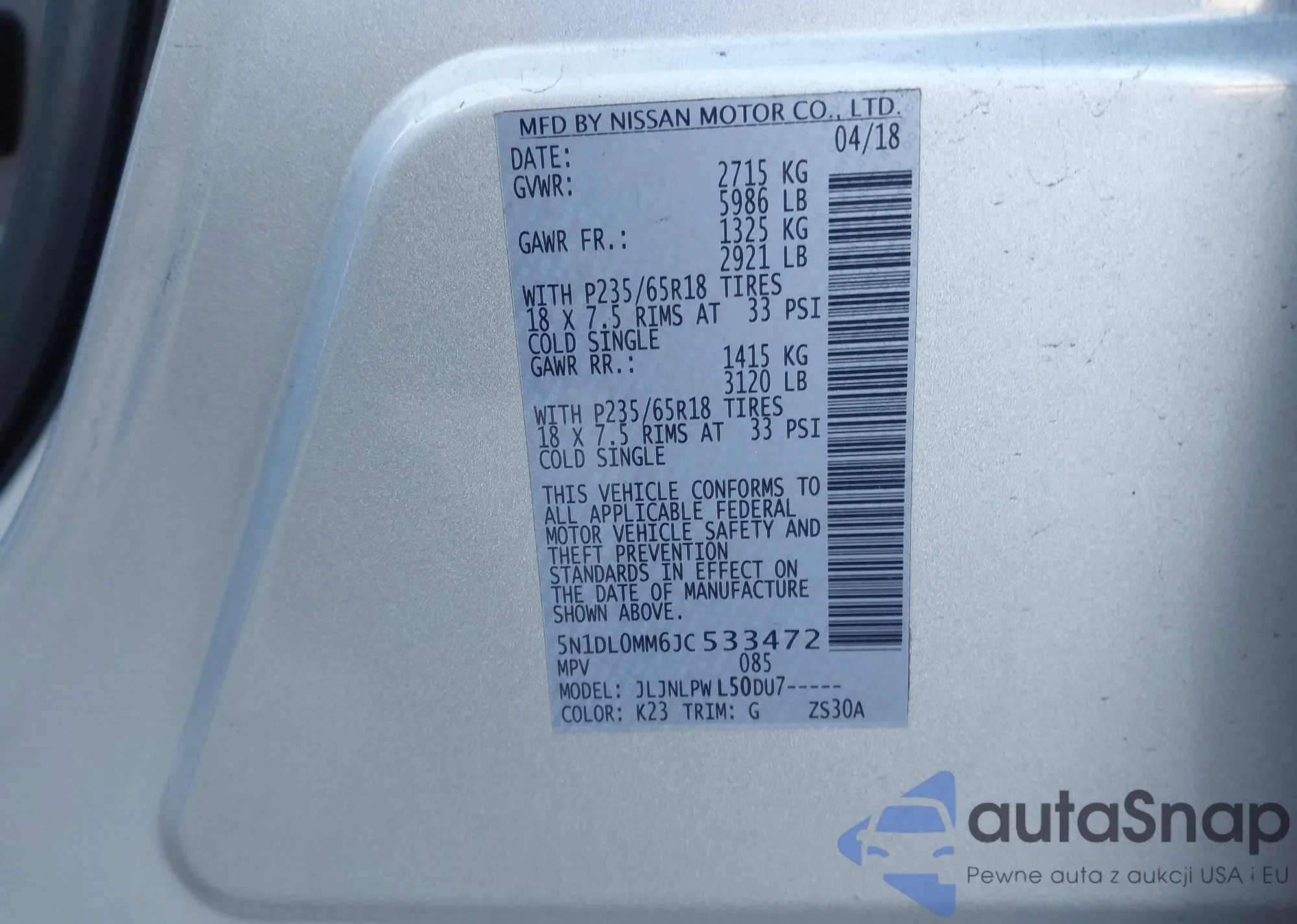 • VIN 5N1DL0MM6JC533472