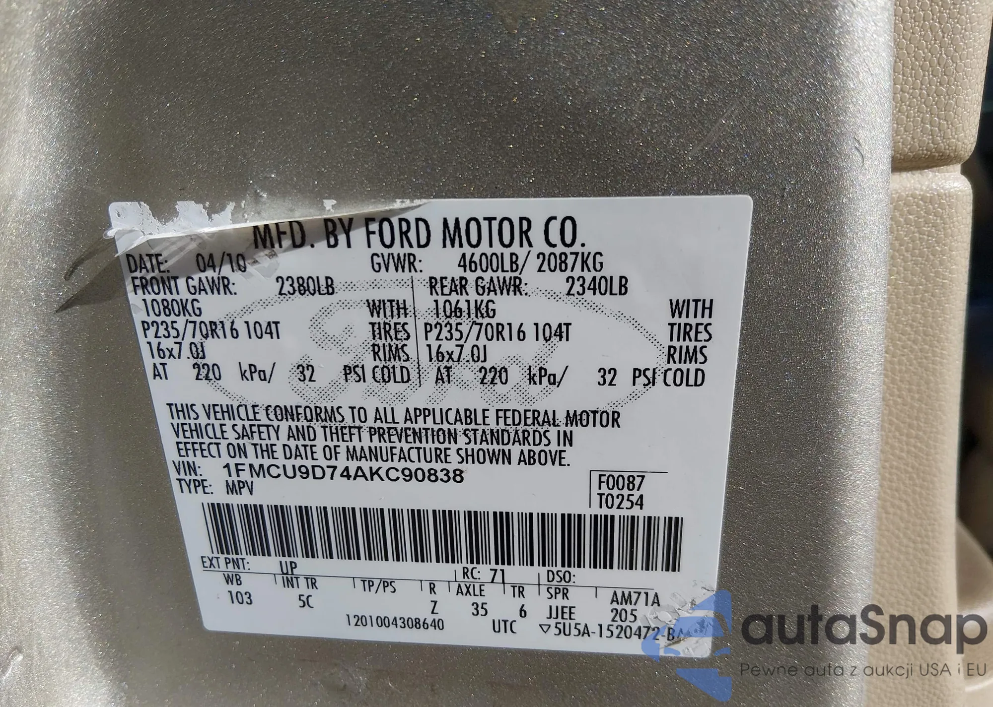 • VIN 1FMCU9D74AKC90838