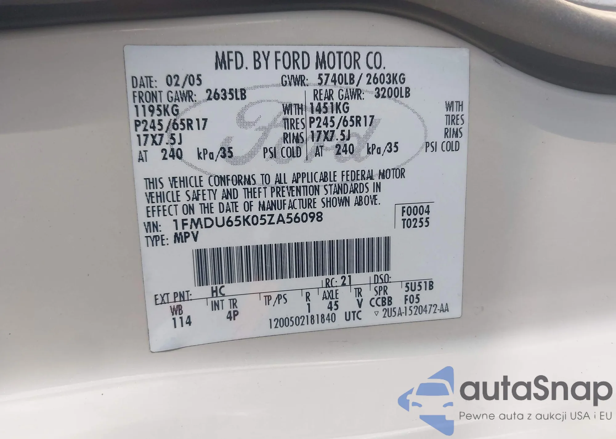 • VIN 1FMDU65K05ZA56098