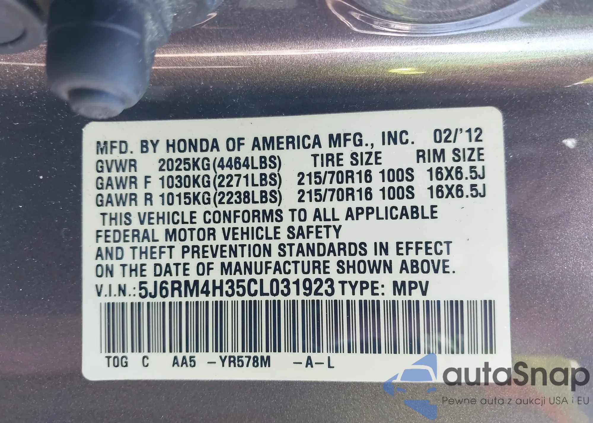 • VIN 5J6RM4H35CL031923