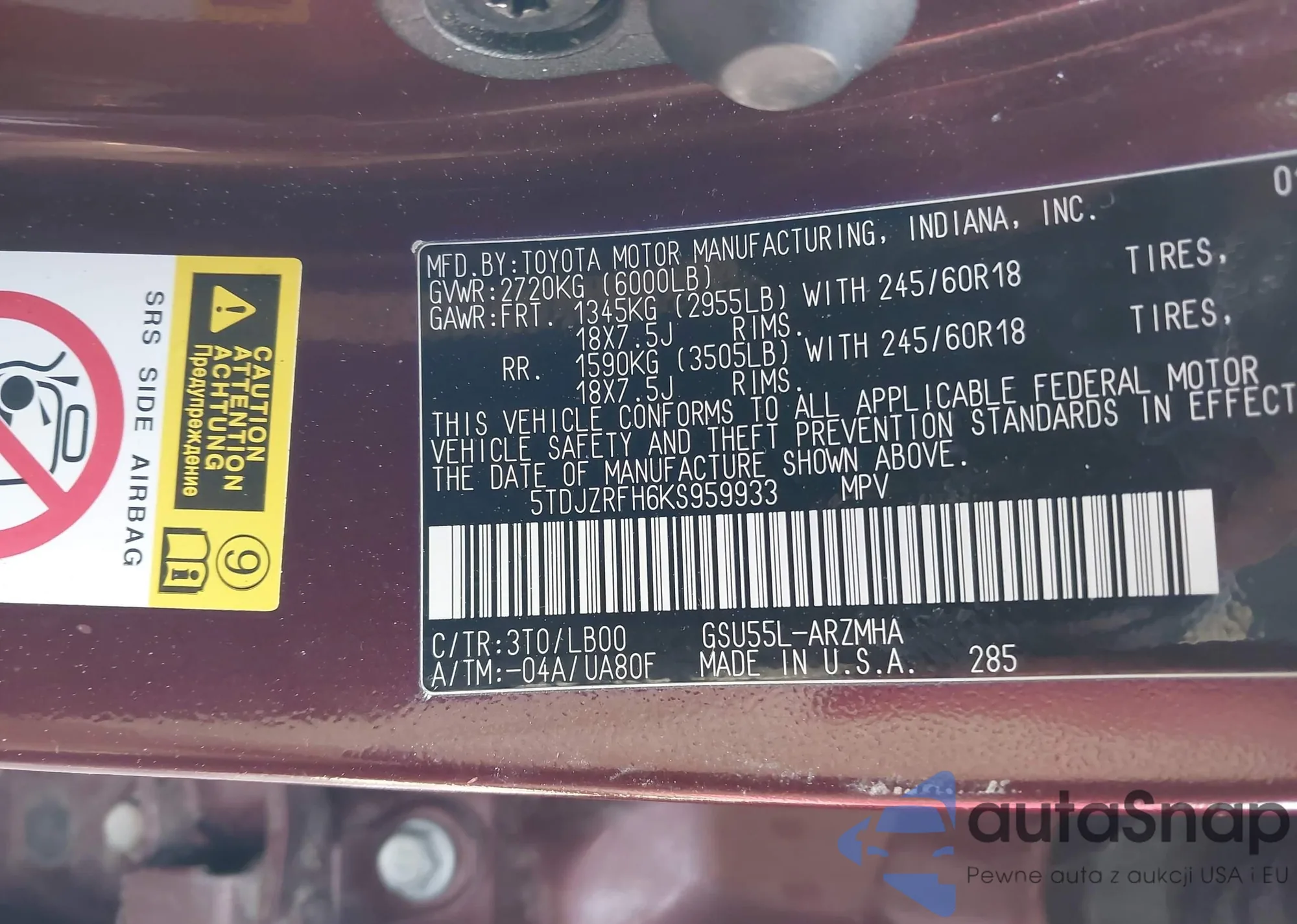 LOT: 44204377 VIN: 5TDJZRFH6KS959933