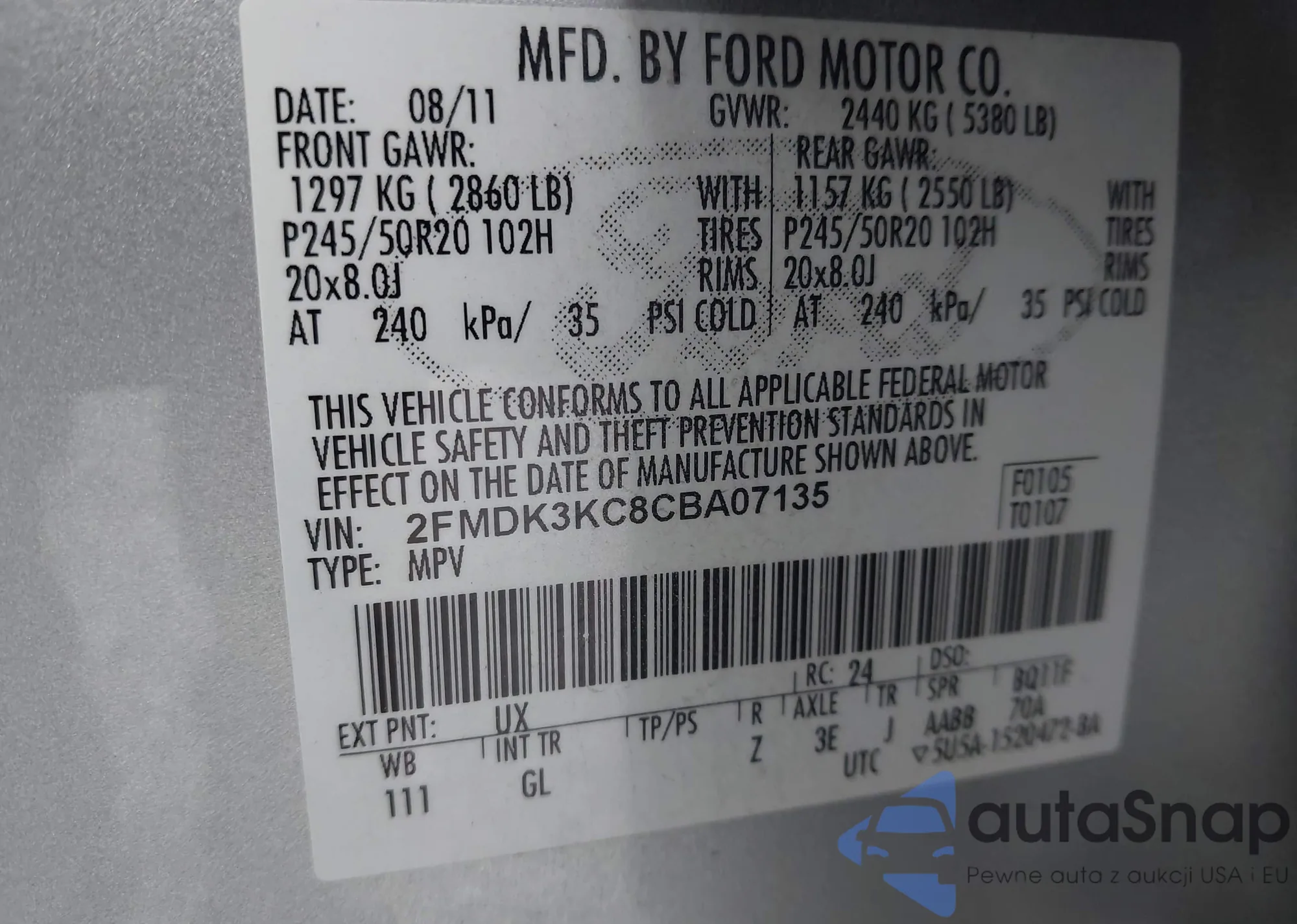 LOT: 44050039 VIN: 2FMDK3KC8CBA07135