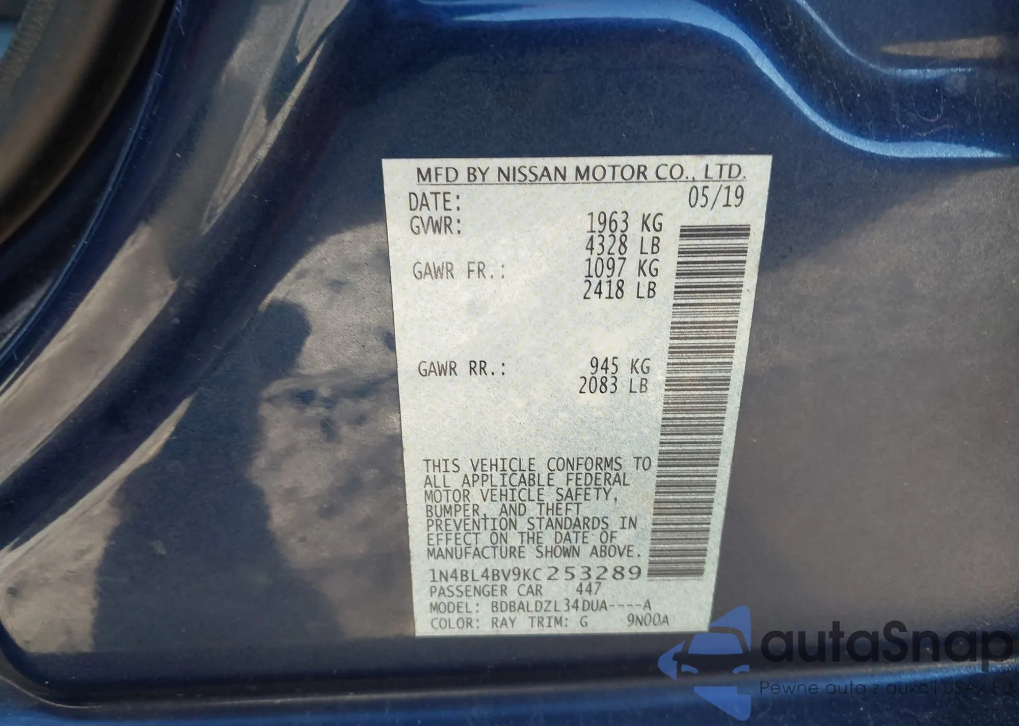 • VIN 1N4BL4BV9KC253289
