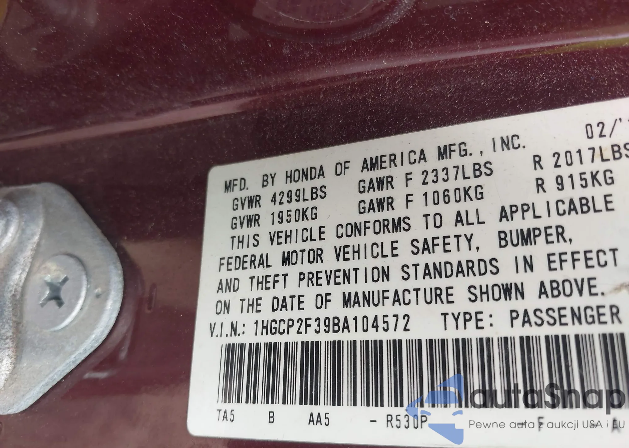 LOT: 43820617 VIN: 1HGCP2F39BA104572