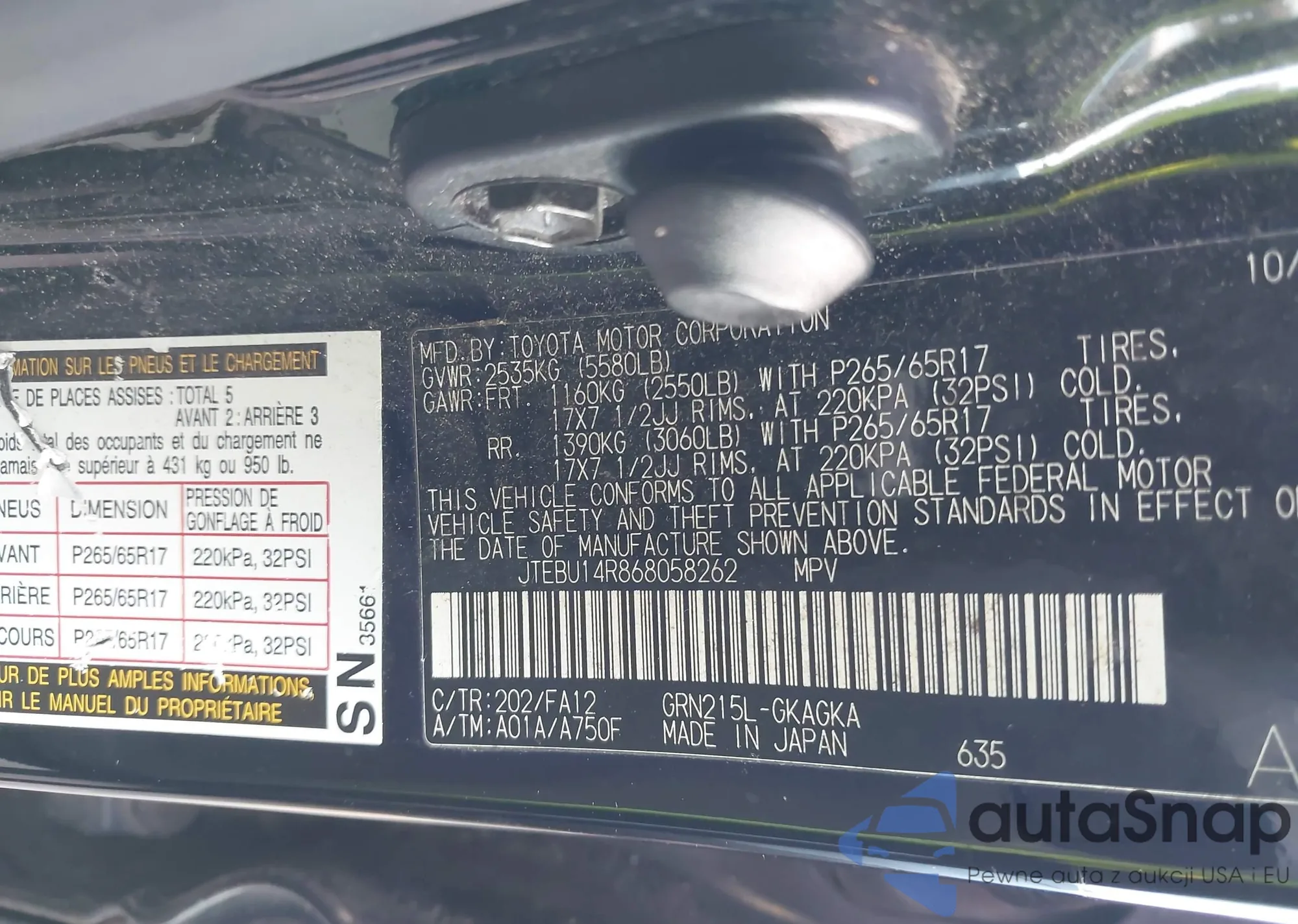 LOT: 44192263 VIN: JTEBU14R868058262