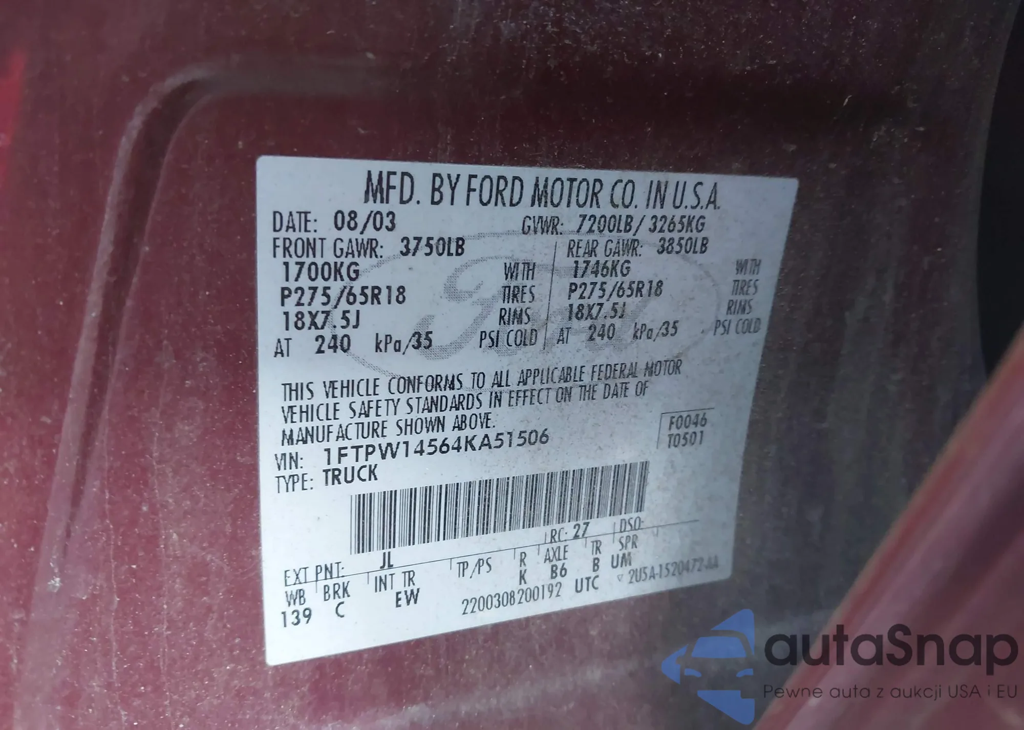 LOT: 44246589 VIN: 1FTPW14564KA51506