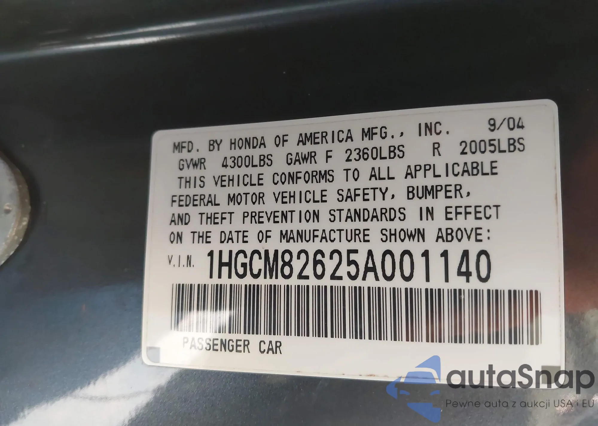 LOT: 44238435 VIN: 1HGCM82625A001140