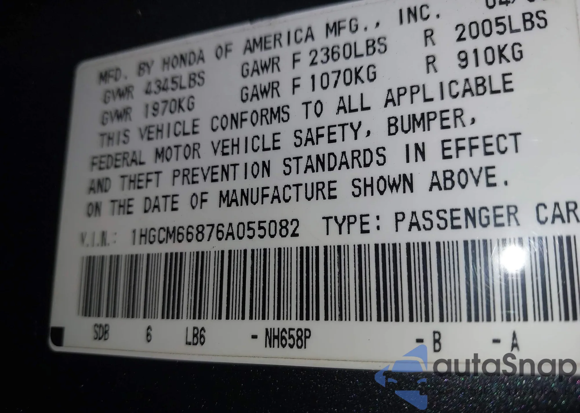 LOT: 44218273 VIN: 1HGCM66876A055082