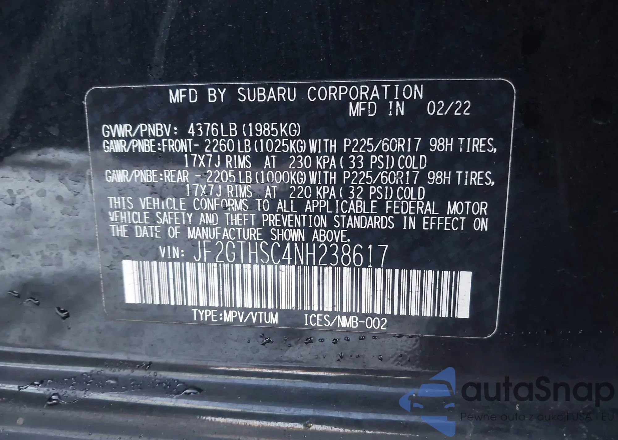 LOT: 43963380 VIN: JF2GTHSC4NH238617