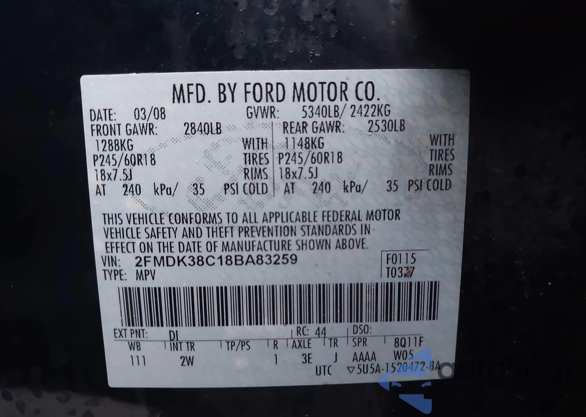 • VIN 2FMDK38C18BA83259