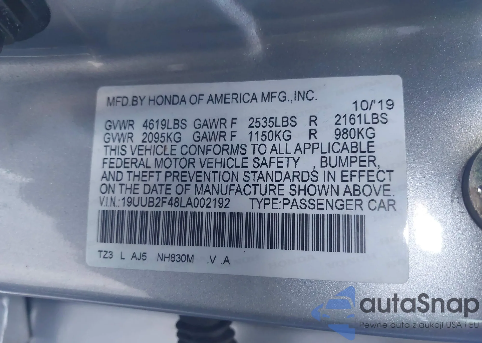• VIN 19UUB2F48LA002192