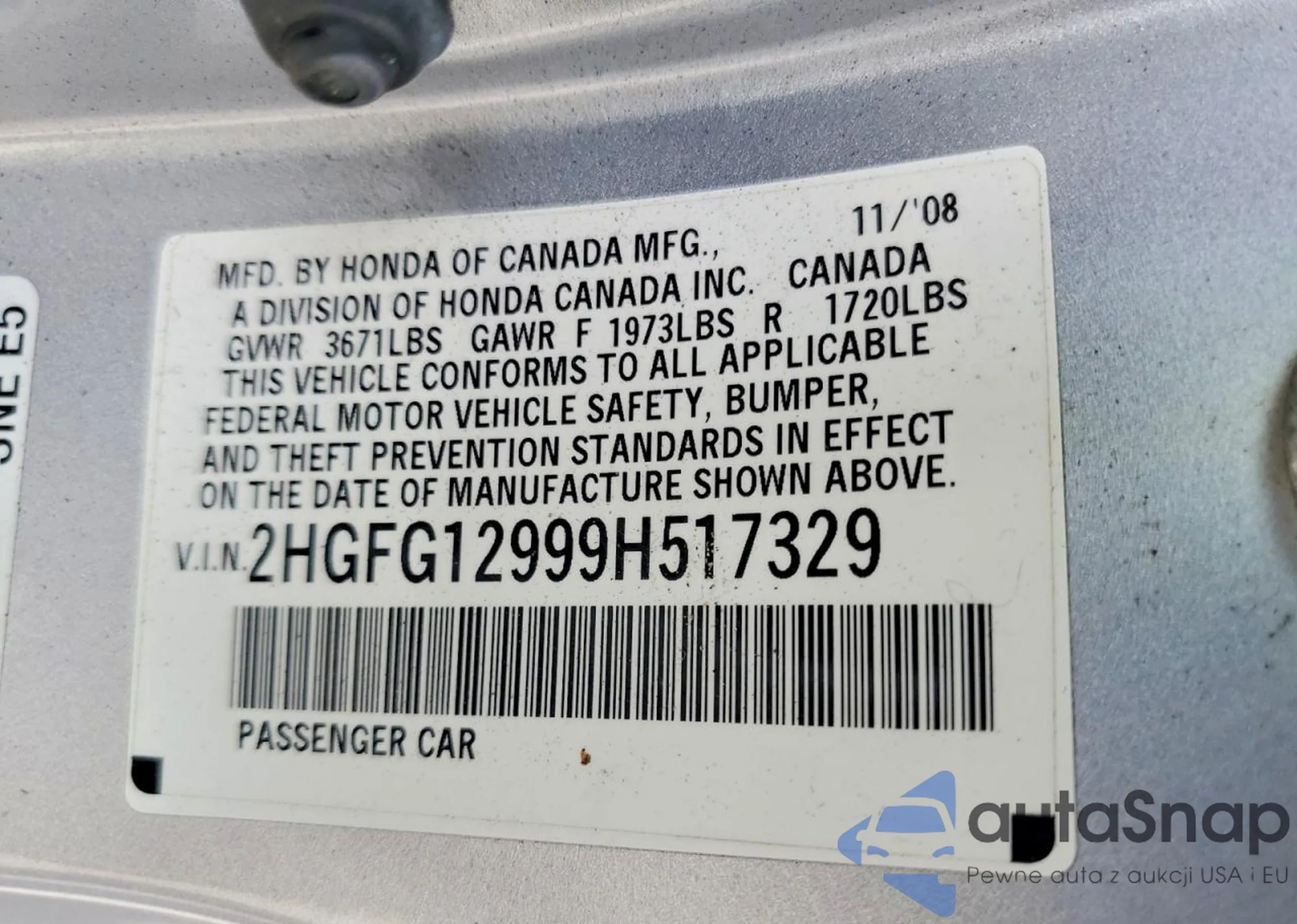 LOT: 72454635 VIN: 2HGFG12999H517329