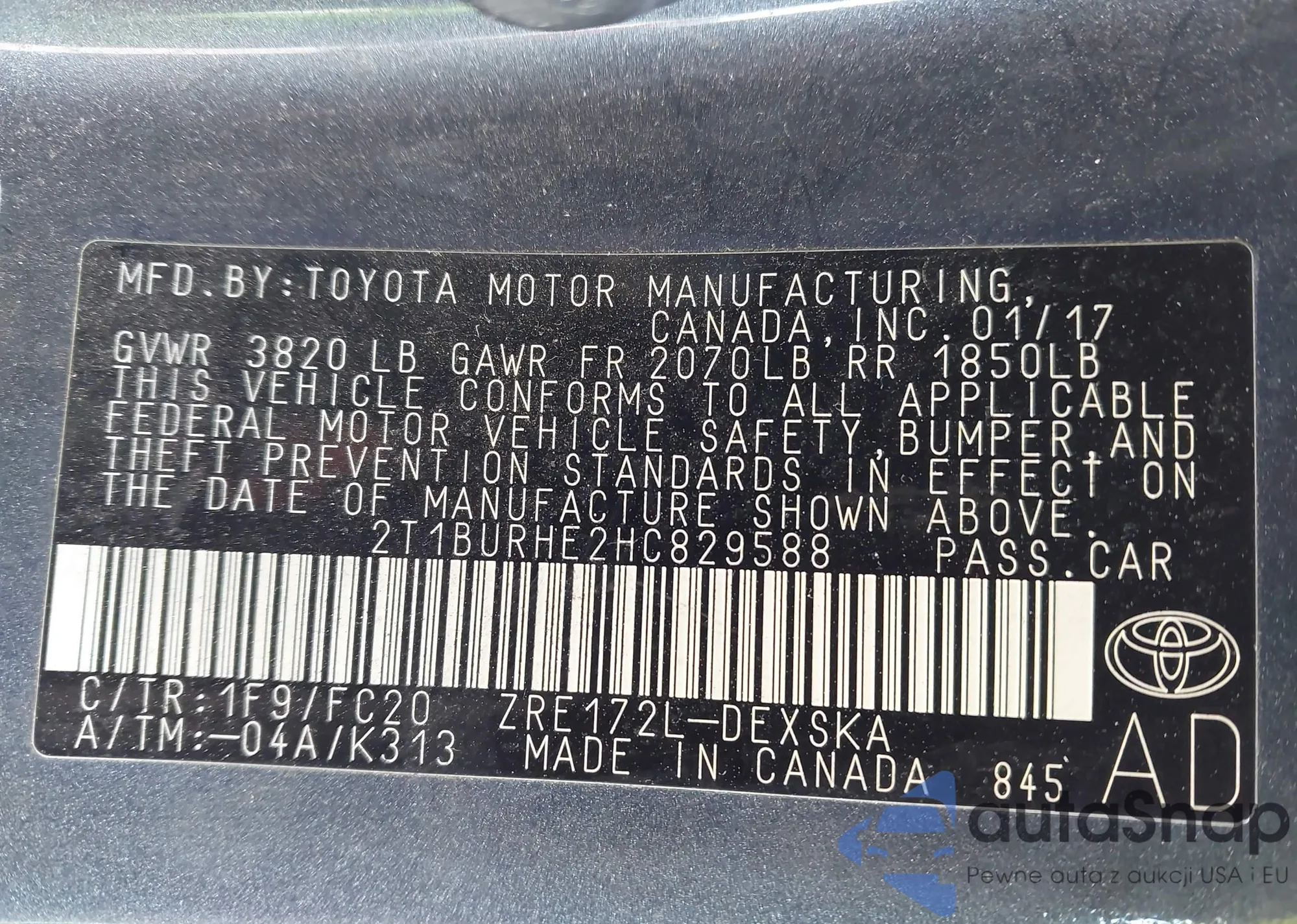 LOT: 44033077 VIN: 2T1BURHE0HC826964