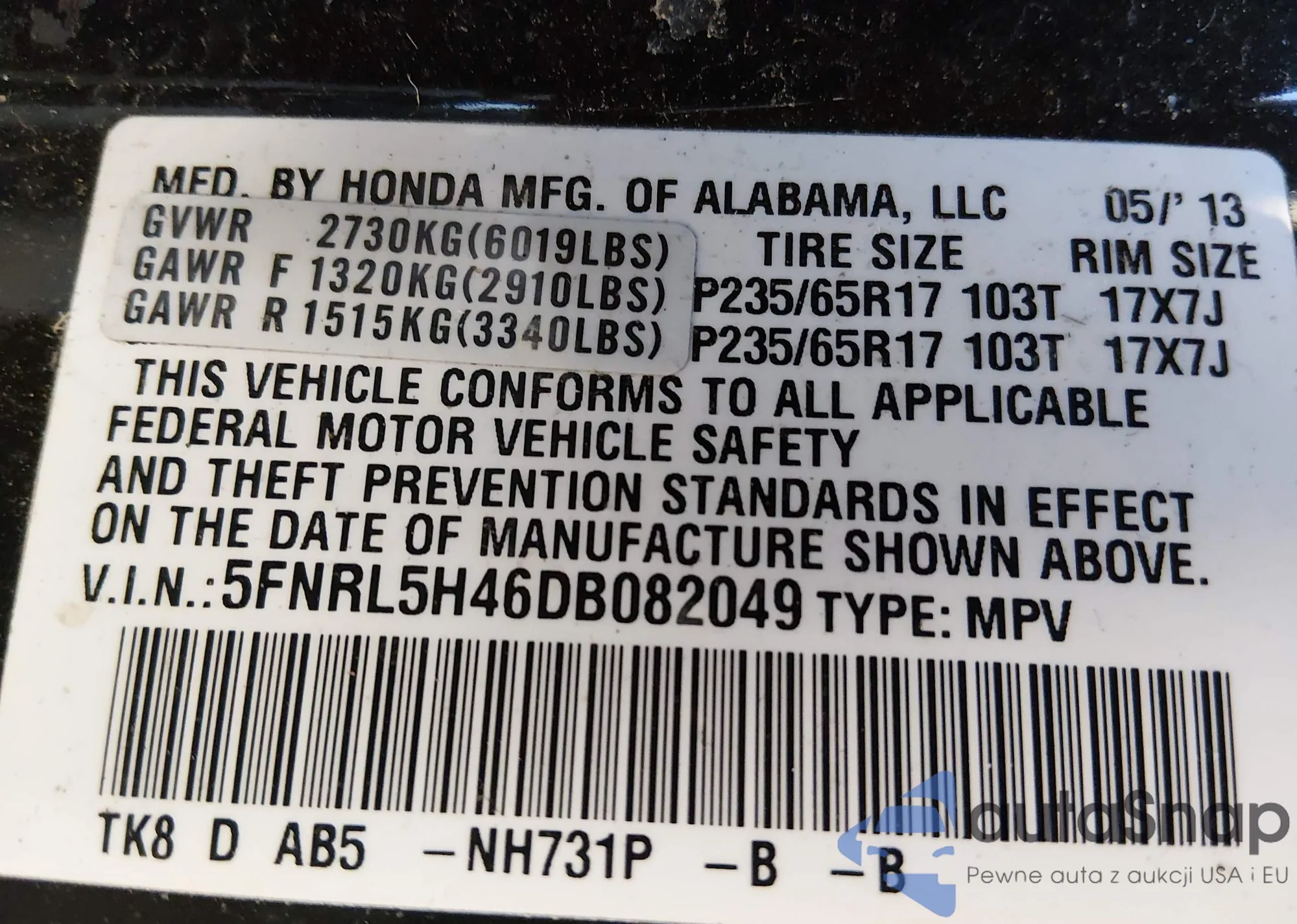 LOT: 44323120 VIN: 1HGCM66565A040559