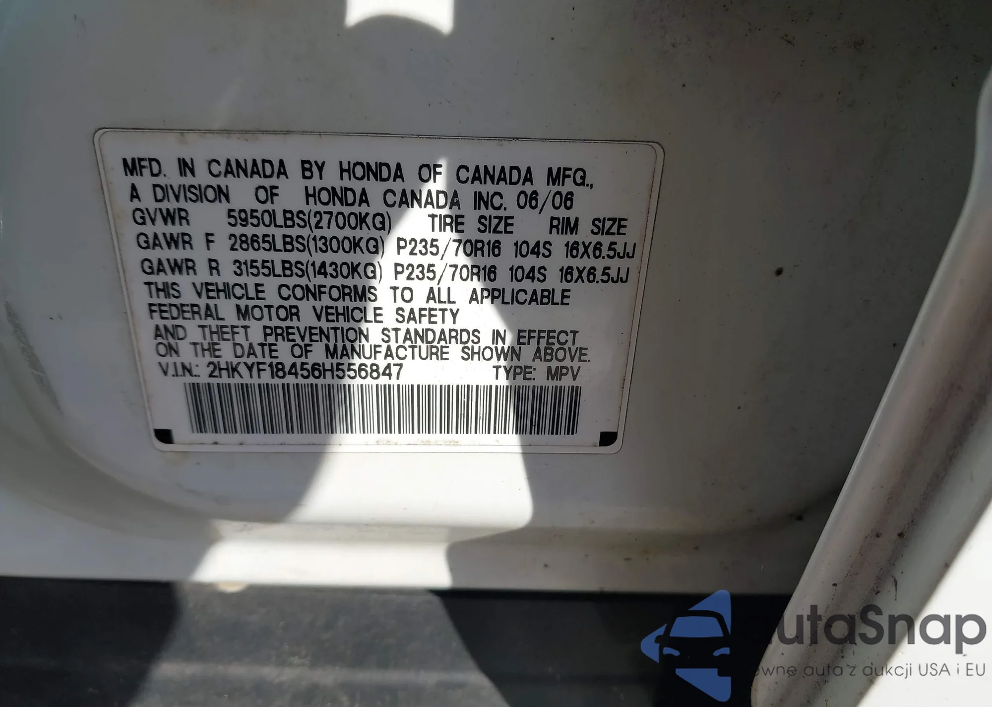 LOT: 44247382 VIN: 2HKYF18456H556847
