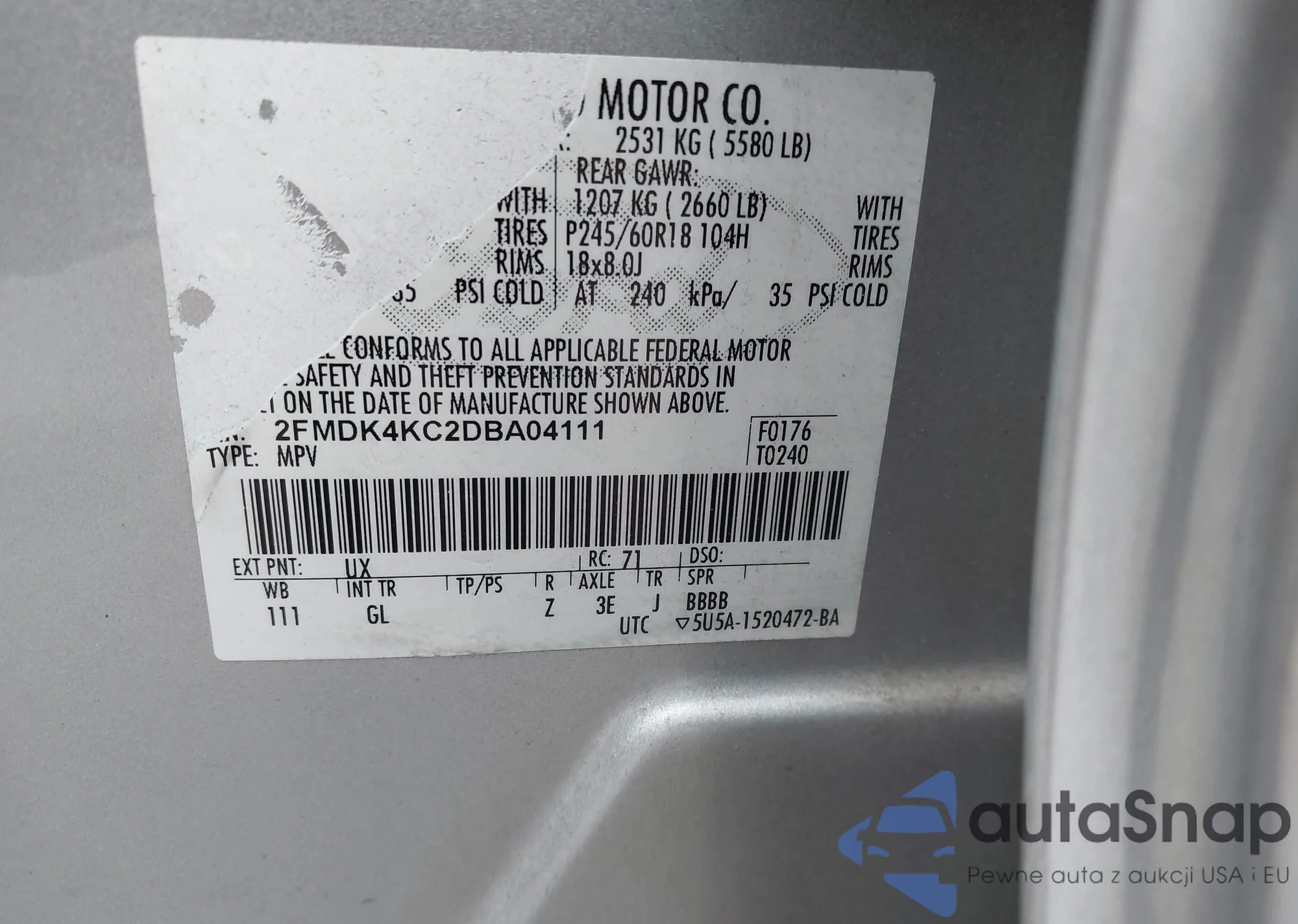 LOT: 44327480 VIN: 2FMDK4KC2DBA04111