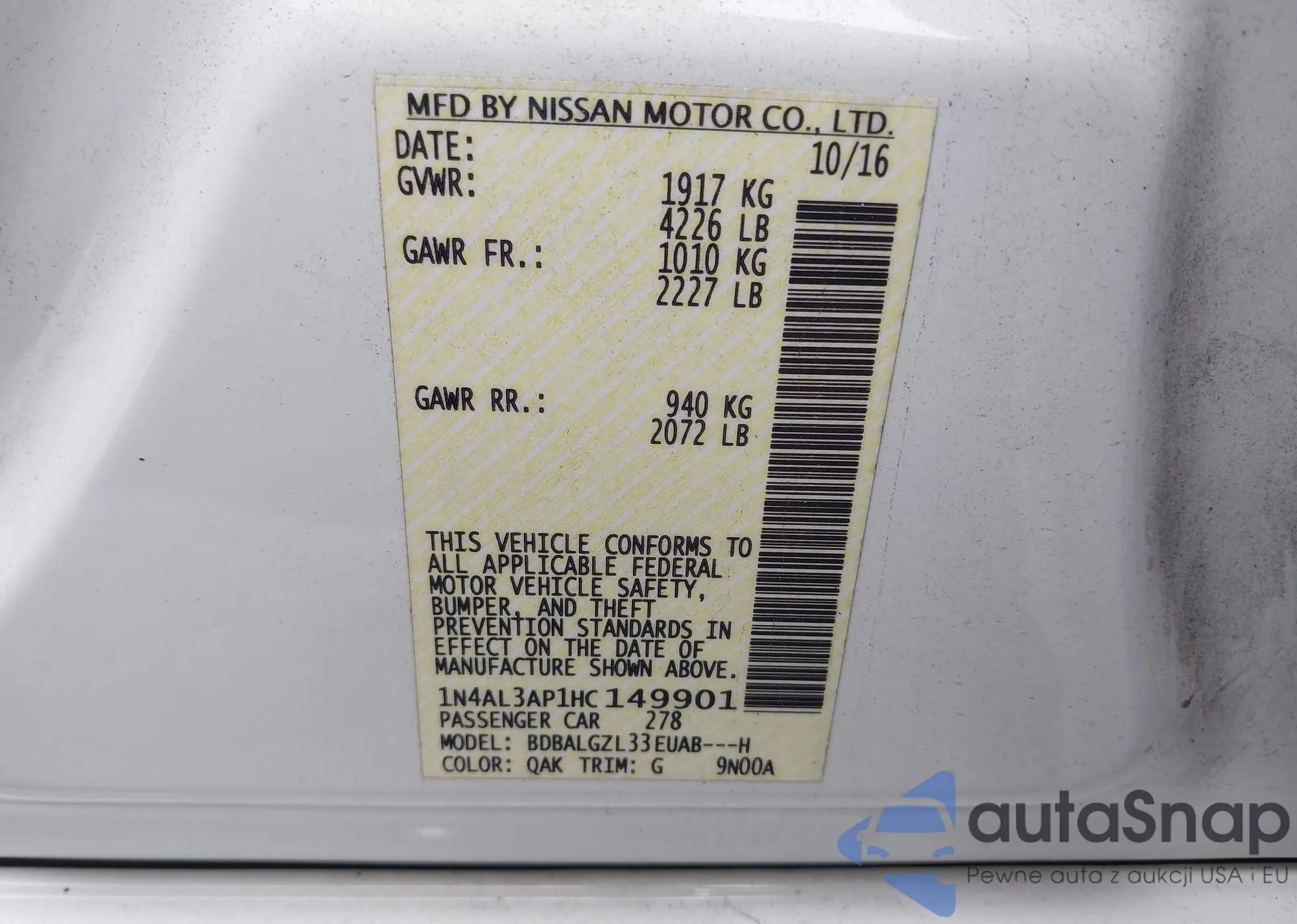 • VIN 1N4AL3AP1HC149901