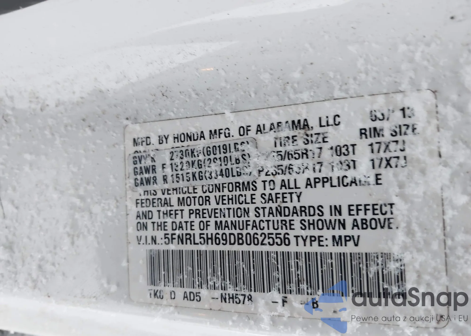 • VIN 5FNYF4H40CB063718