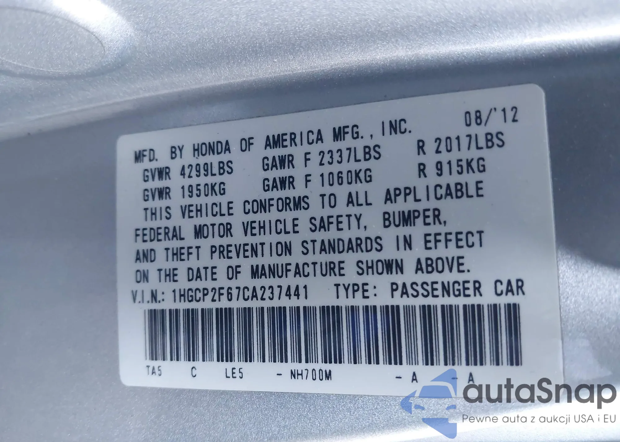 LOT: 43935116 VIN: 1HGCP2F67CA237441