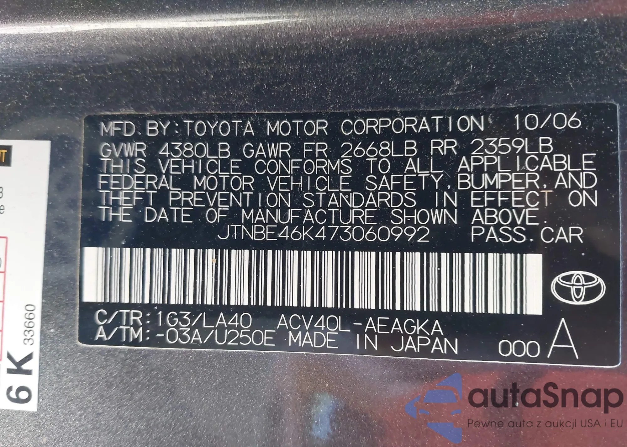 LOT: 44284532 VIN: JTNBE46K473060992