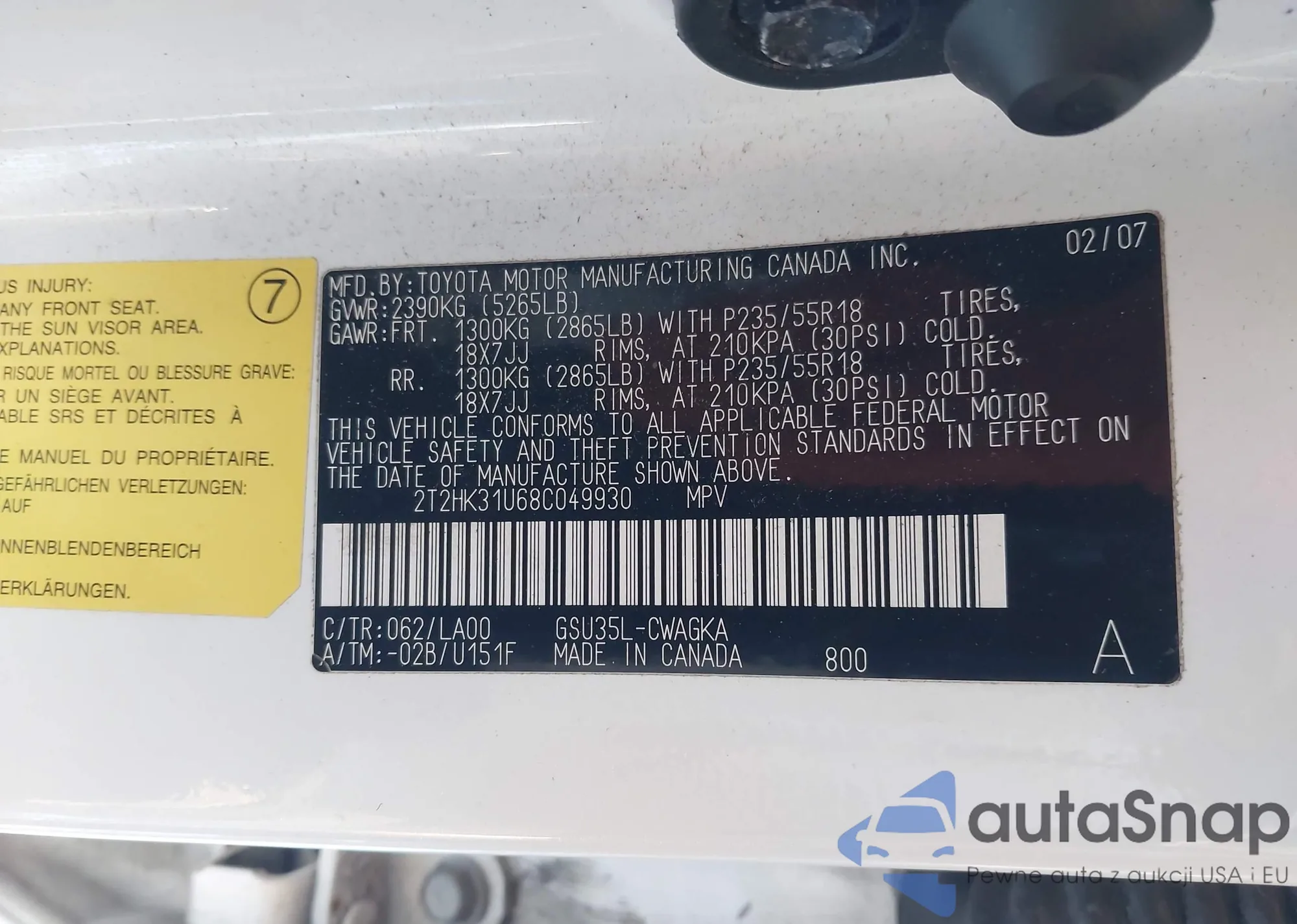 LOT: 44289363 VIN: 2T2HK31U68C049930